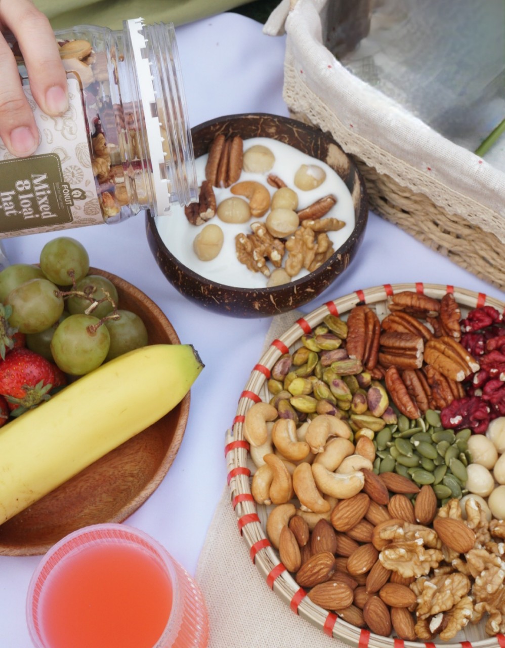 Mix hạt dinh dưỡng ăn liền tại Holinut Thành phần: Hạt bí rang, hạnh nhân rang mộc, nhân óc chó vàng, nhân macca, điều tách lụa. Quy cách: hũ/500gram Công dụng của 5 loại hạt mix