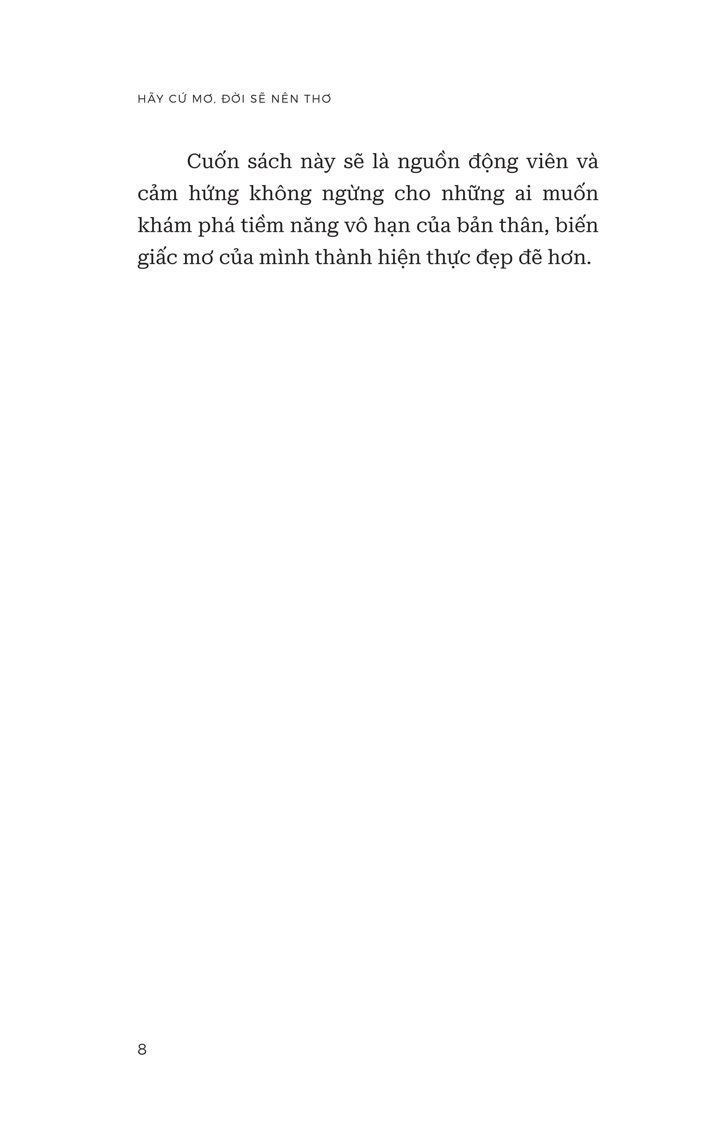 Dám mơ mộng không chỉ là việc nói ra những điều không tưởng, mà còn là việc dấn thân vào hành động để biến chúng thành hiện thực. Cuốn sách này sẽ là nguồn động viên và cảm hứng không ngừng cho những ai muốn khám phá tiềm năng vô hạn của bản thân, biến giấc mơ của m.ình thành hiện thực đẹp đẽ hơn.