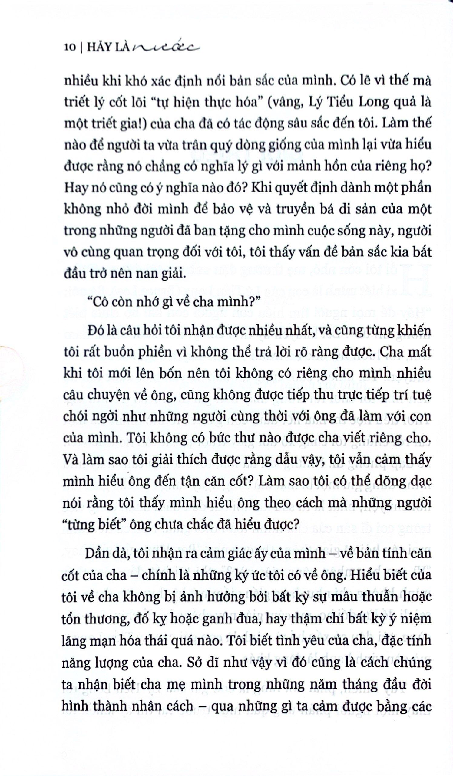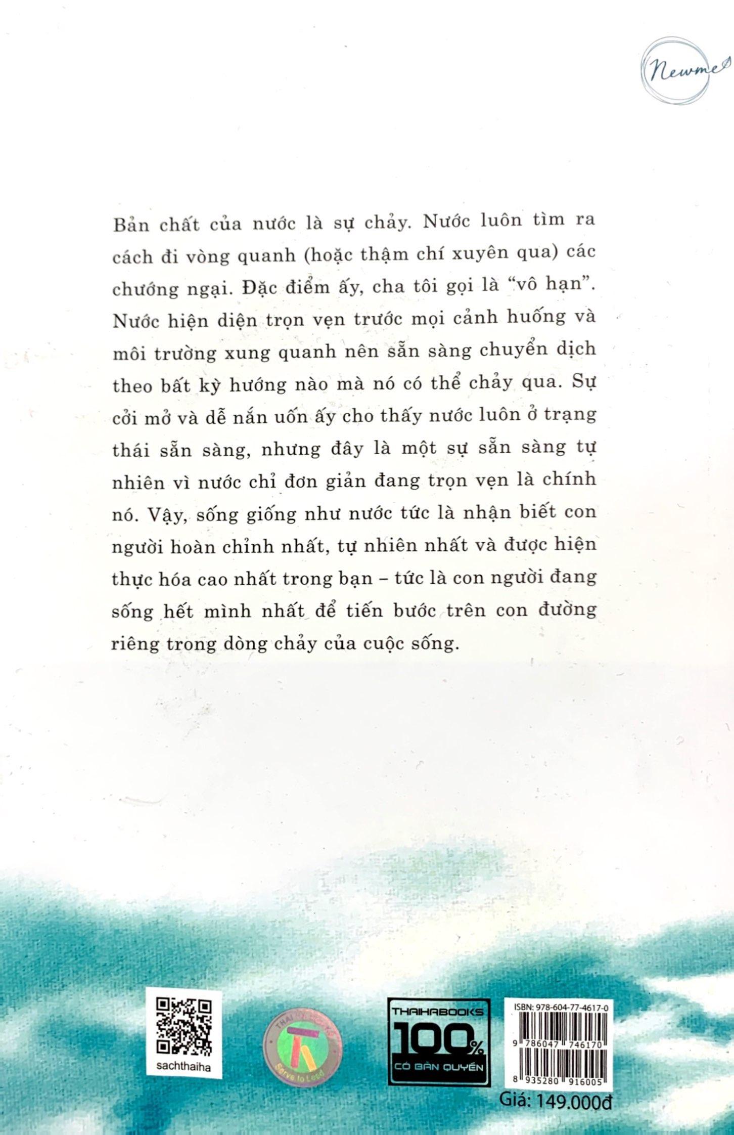 Bản chất của nước là sự chảy. Nước luôn tìm ra cách đi vòng quanh (hoặc thậm chí xuyên qua) các chướng ngại. Đặc điểm ấy, cha tôi gọi là “vô hạn”. Nước hiện diện trọn vẹn trước mọi cảnh huống và môi trường xung quanh nên sẵn sàng chuyển dịch theo bất kỳ hướng nào mà nó có thể chảy qua. Sự cởi mở và dễ uống nắn ấy cho thấy nước luôn ở trạng thái sẵn sàng, nhưng đây là một sự sẵn sàng tự nhiên vì nước chỉ đơn giản đang trọn vẹn là chính nó. Vậy, sống giống như nước tức là nhận biết con người hoàn chỉnh nhất, tự nhiên nhất và được hiện thực hoá cao nhất trong bạn – tức là con người đang sống hết m.ình để tiến bước trên con đường riêng trong dòng chảy của cuộc sống.