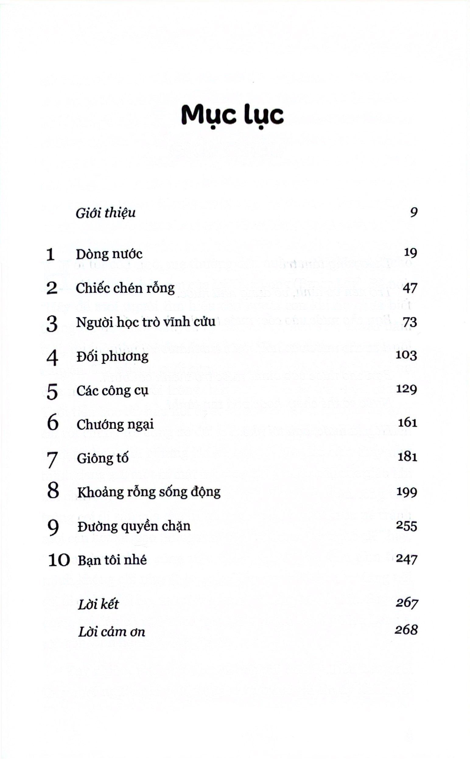 Đối với cha tôi, “hòa m.ình vào dòng chảy” một phần có nghĩa là luôn thực sự hiện diện – sống có ý thức, sống chủ động, có mục đích. Thực sự hiện diện không chỉ là chiếm lấy một khoảng không vật lý. Vấn đề không phải ở chỗ bạn có mặt trong lớp, mà là bạn có chủ động tham gia vào lớp học hay không. Bạn có đang lắng nghe, đặt câu hỏi, ghi chép, và tham gia vào cuộc trao đổi không? Hay thân thể bạn ở đó còn đầu óc bạn thì để vào điện thoại, bạn lơ mơ nửa thức nửa ngủ, trùm mũ kín đầu còn tai thì đeo thiết bị nghe nhạc? Thực sự hiện diện là một phần then chốt của việc sống giống như nước.