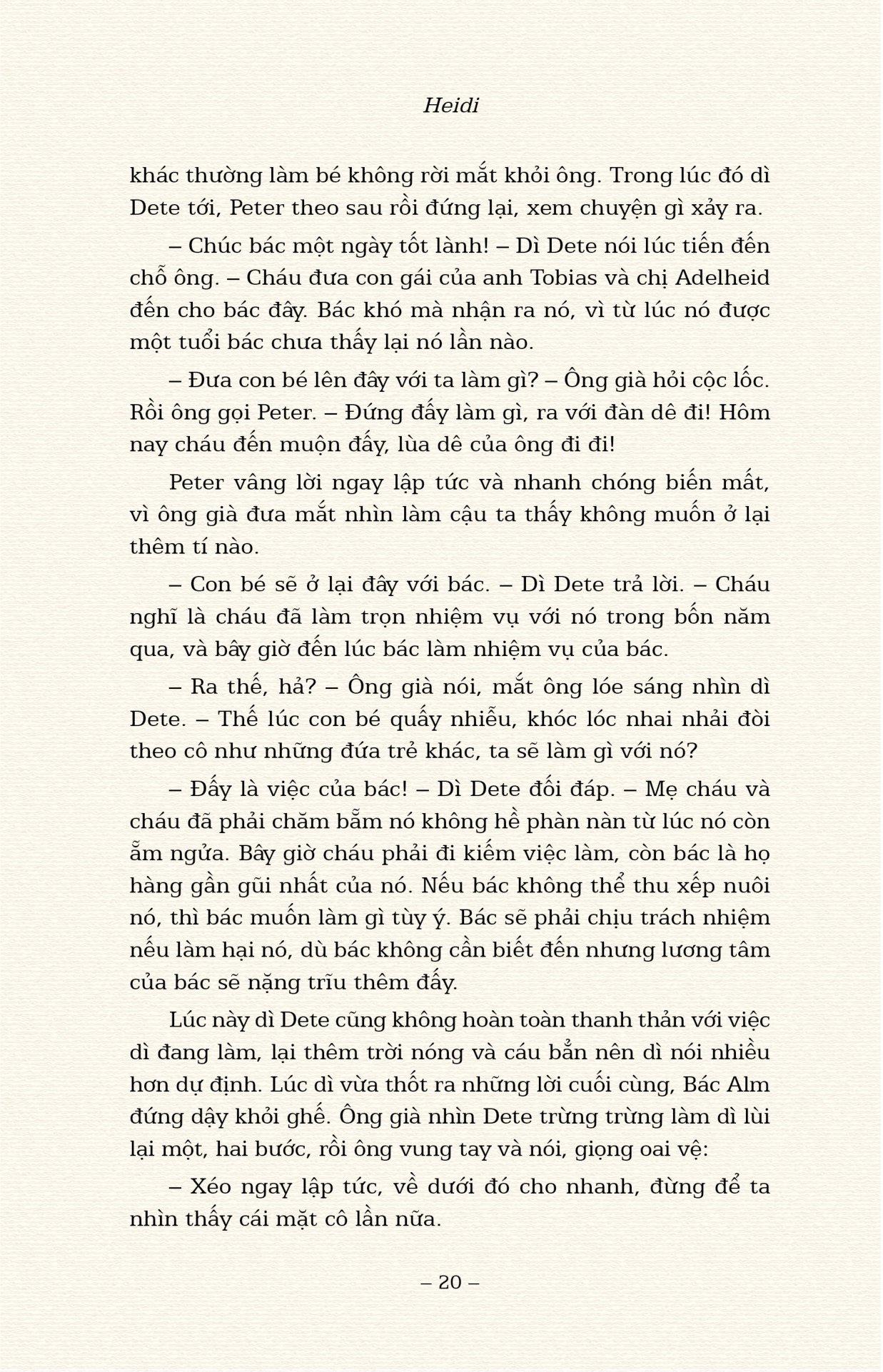 Cuốn sách kinh điển của Johanna Spyri đã được Đông A xuất bản với bản dịch được yêu thích của dịch giả Thanh Vân, minh họa của Elena Selivanova. Sách in màu, bìa cứng, có bìa áo.