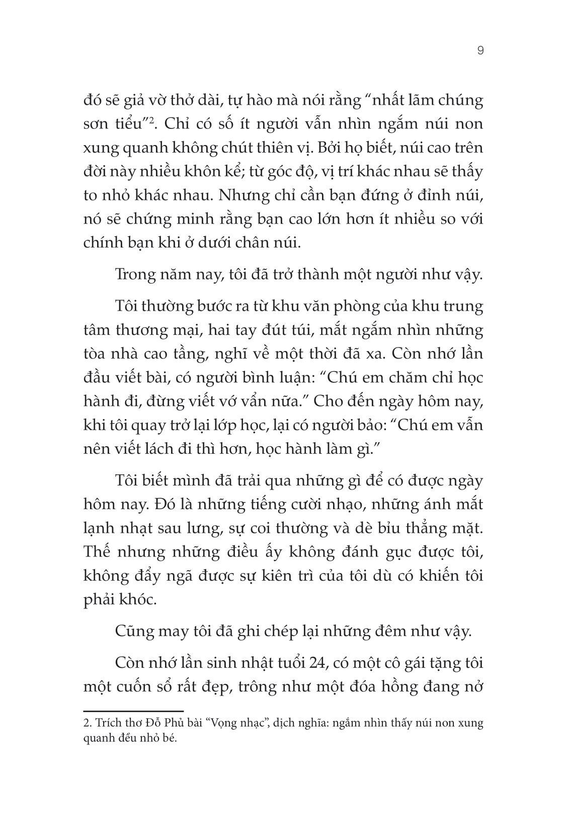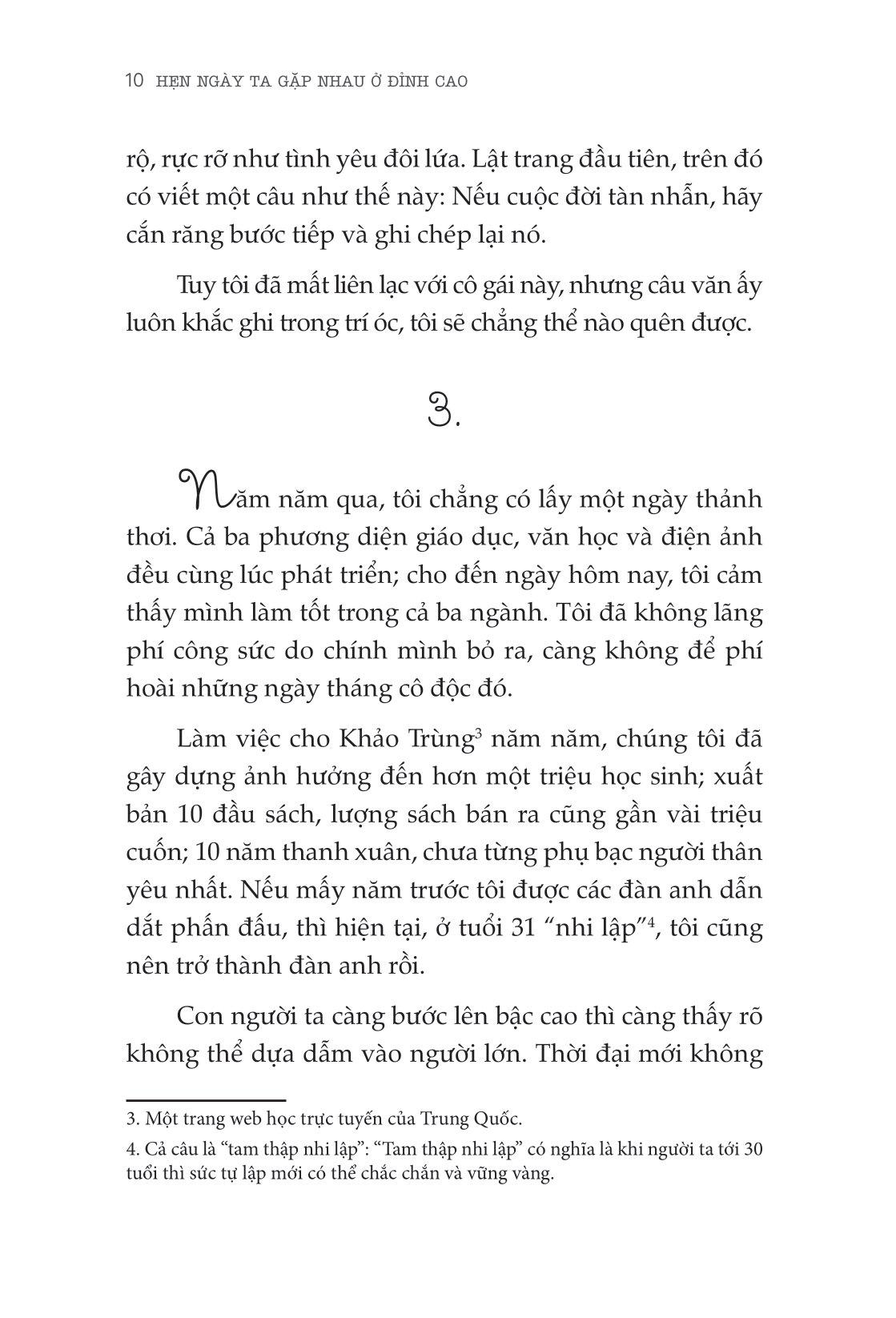 Ở đỉnh cao đó, chúng ta đều có thể gặp được những người ưu tú và đặc biệt là gặp được một phiên bản tốt hơn của chính bản thân. Vì vậy, qua cuốn sách Hẹn ngày ta gặp nhau ở đỉnh cao tác giả Lý Thượng Long muốn nhắn nhủ đến tất cả độc giả một lời khuyên chân thành: “Nếu cuối cùng đều phải nói lời tạm biệt, hãy nói lời tạm biệt với bản thân tồi tệ trong quá khứ của bạn đi!”