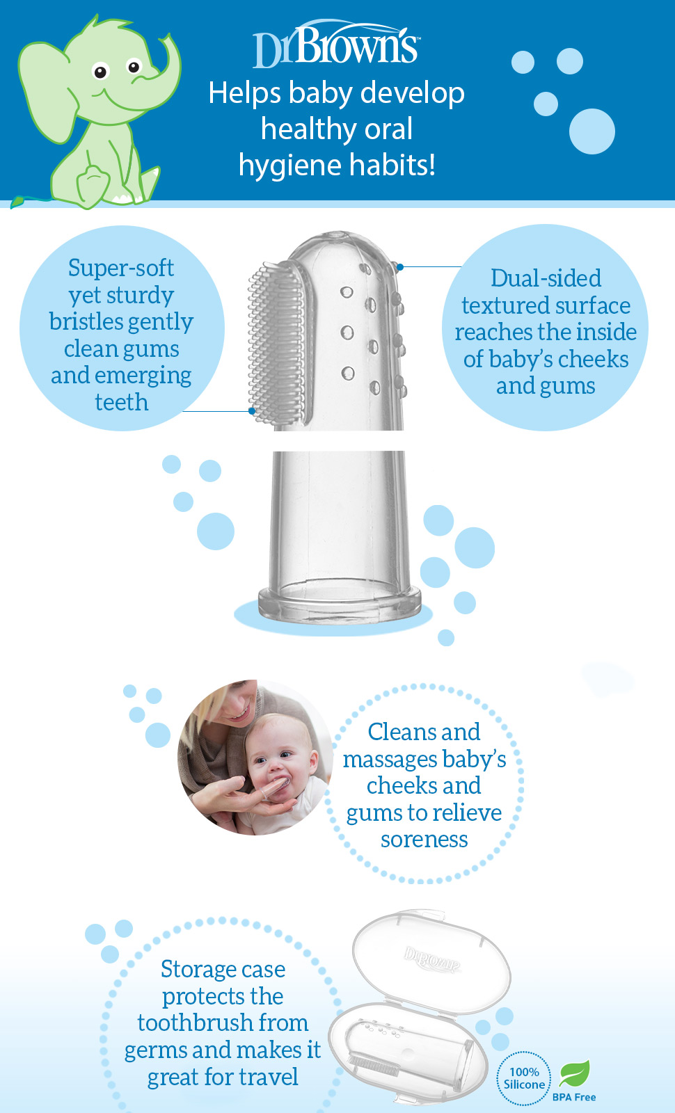 - 100% silicon, dễ dàng vệ sinh và làm sạch. Với tính an toàn và tiện lợi, Bàn chải răng ngón tay Dr.Brown's là sự lựa chọn để chăm sóc răng miệng cho bé yêu của bạn, mang lại nụ cười sáng bóng trên khuôn mặt bé và giữ cho răng miệng của bé luôn khỏe mạnh Thiết kế thông minh và chất liệu cao cấp, sản phẩm này đã trở thành sự lựa chọn ưu tiên của nhiều bậc phụ huynh trên toàn thế giới Được làm từ silicone cao cấp, mềm mại, không mùi, không chứa BPA và các chất độc hại khác, bạn sẽ hoàn toàn yên tâm về tính an toàn cho sức khỏe của con bạn. Thiết kế bề mặt phù hợp với vòm miệng của trẻ với mặt lông chải silicon giúp làm sạch hiệu quả bụi bẩn và mảng bám trên răng, đồng thời có tác dụng mát-xa lợi giảm ngứa cho bé Đi kèm với Bàn chải răng ngón tay Dr.Brown's là một hộp đựng nhỏ gọn và tiện lợi, giúp bạn bảo quản và vận chuyển sản phẩm một cách dễ dàng. Không chỉ sử dụng cho bé, sản phẩm cũng có thể được dùng cho người lớn có nhu cầu chăm sóc răng miệng đặc biệt hoặc người già yếu không thể sử dụng bàn chải răng thông thường Bạn có thể dùng Bàn chải răng ngón tay Dr.Brown's để làm sạch răng cho bé khi đang di chuyển, đi du lịch hoặc đi công tác mà không cần mang theo nhiều dụng cụ chăm sóc răng miệng. Đồng thời, việc làm sạch răng cho bé sẽ trở nên dễ dàng và thoải mái hơn, giúp bé phát triển thói quen chăm sóc răng miệng từ nhỏ.