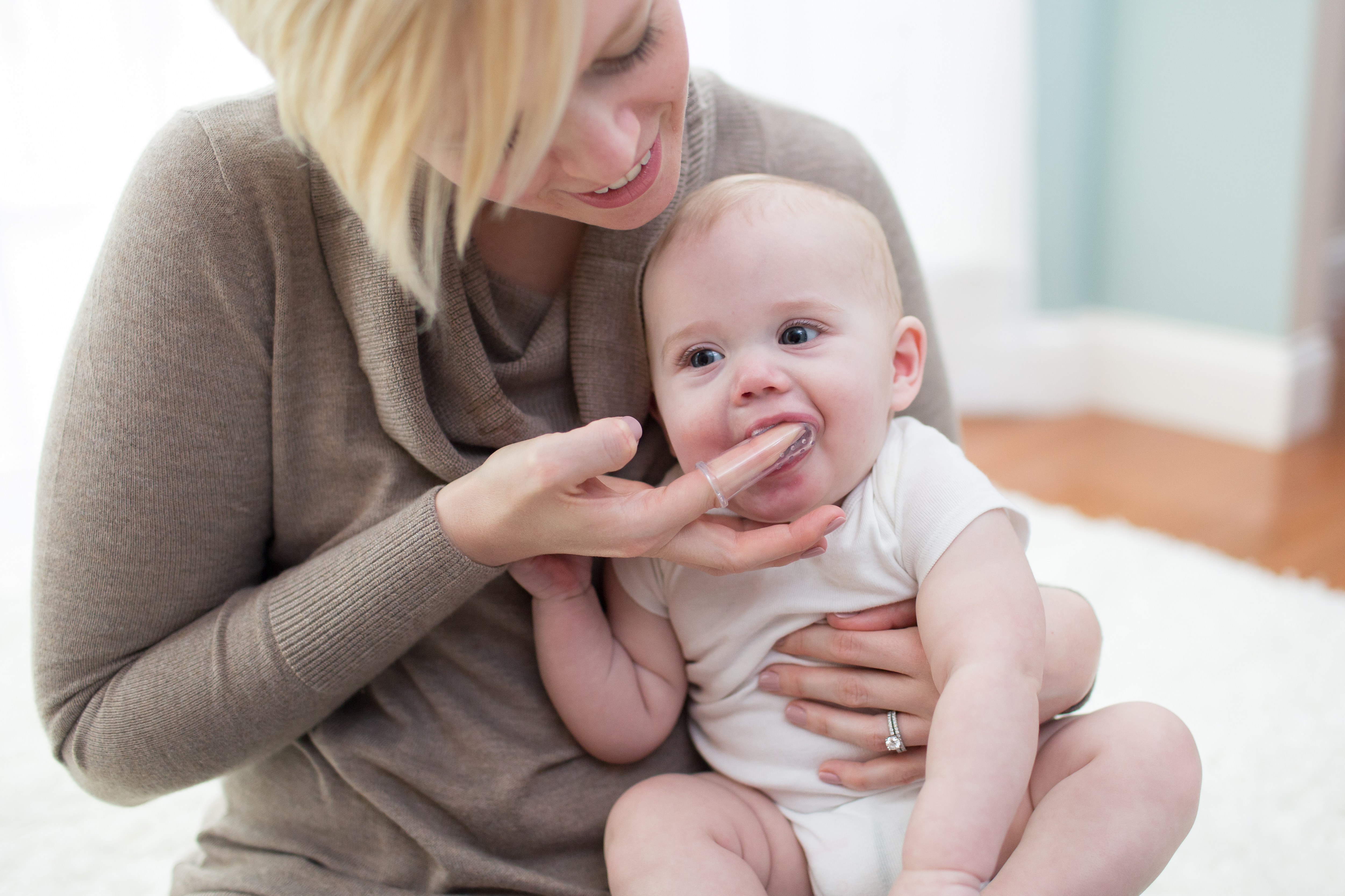 - Dùng một lượng nhỏ kem đánh răng dành cho trẻ lên lớp lông silicone của bàn chải răng ngón tay
