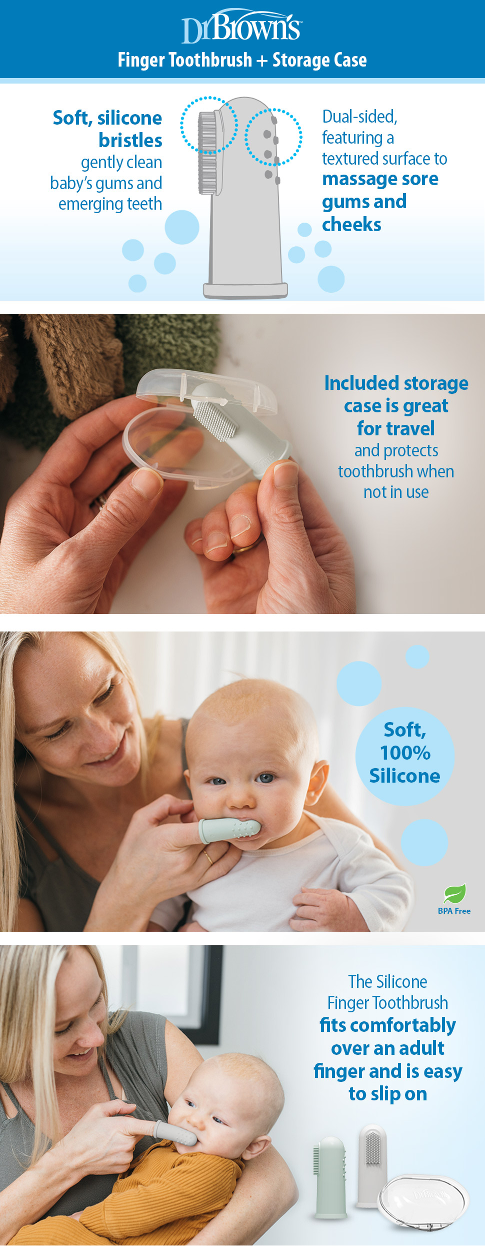 - 100% silicon, dễ dàng vệ sinh và làm sạch. Với tính an toàn và tiện lợi, Bàn chải răng ngón tay Dr.Brown's là sự lựa chọn để chăm sóc răng miệng cho bé yêu của bạn, mang lại nụ cười sáng bóng trên khuôn mặt bé và giữ cho răng miệng của bé luôn khỏe mạnh Thiết kế thông minh và chất liệu cao cấp, sản phẩm này đã trở thành sự lựa chọn ưu tiên của nhiều bậc phụ huynh trên toàn thế giới Được làm từ silicone cao cấp, mềm mại, không mùi, không chứa BPA và các chất độc hại khác, bạn sẽ hoàn toàn yên tâm về tính an toàn cho sức khỏe của con bạn. Thiết kế bề mặt phù hợp với vòm miệng của trẻ với mặt lông chải silicon giúp làm sạch hiệu quả bụi bẩn và mảng bám trên răng, đồng thời có tác dụng mát-xa lợi giảm ngứa cho bé Đi kèm với Bàn chải răng ngón tay Dr.Brown's là một hộp đựng nhỏ gọn và tiện lợi, giúp bạn bảo quản và vận chuyển sản phẩm một cách dễ dàng. Không chỉ sử dụng cho bé, sản phẩm cũng có thể được dùng cho người lớn có nhu cầu chăm sóc răng miệng đặc biệt hoặc người già yếu không thể sử dụng bàn chải răng thông thường Bạn có thể dùng Bàn chải răng ngón tay Dr.Brown's để làm sạch răng cho bé khi đang di chuyển, đi du lịch hoặc đi công tác mà không cần mang theo nhiều dụng cụ chăm sóc răng miệng. Đồng thời, việc làm sạch răng cho bé sẽ trở nên dễ dàng và thoải mái hơn, giúp bé phát triển thói quen chăm sóc răng miệng từ nhỏ.