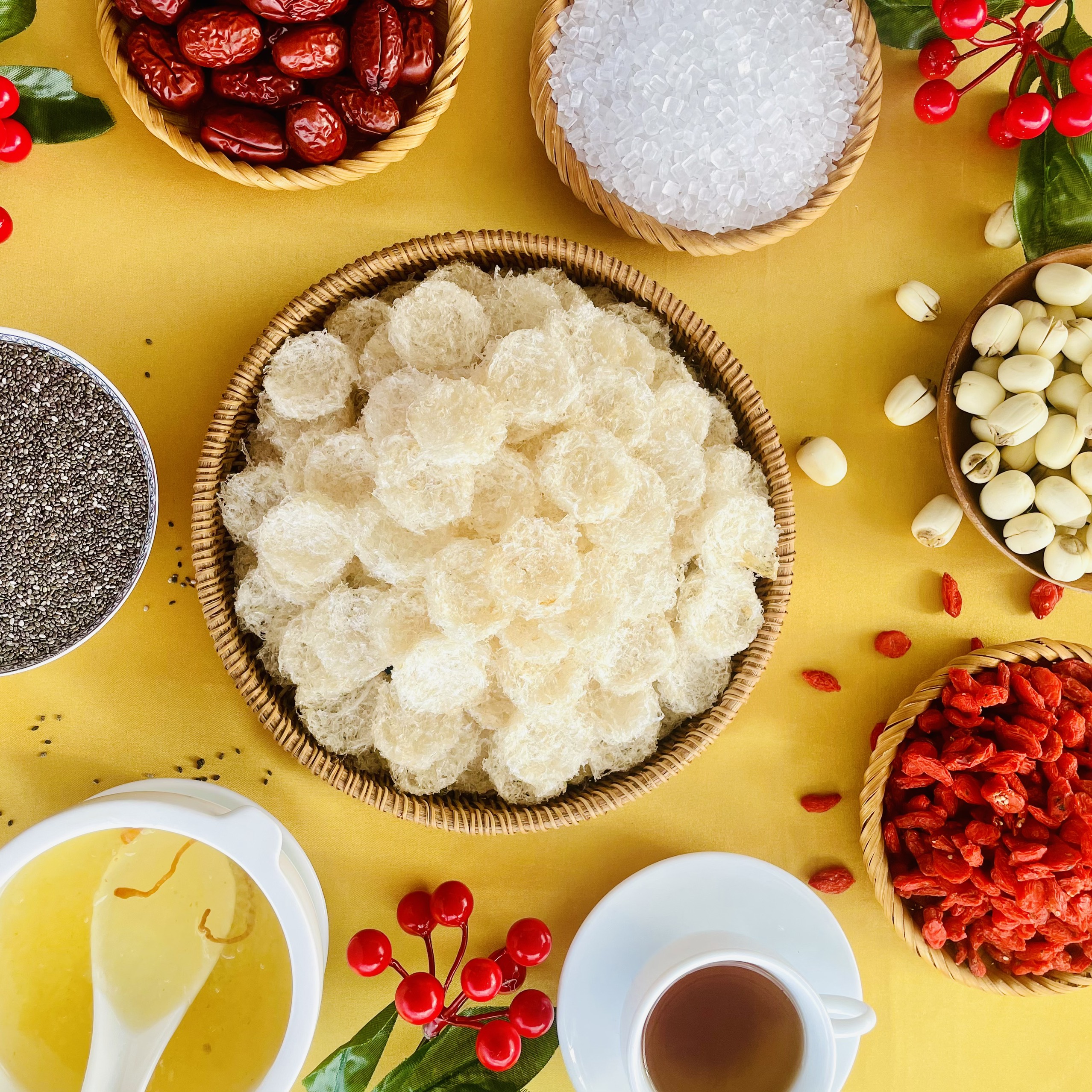 Chưng cách thủy cùng với táo đỏ, đường phèn và hạt chia (tặng kèm).
