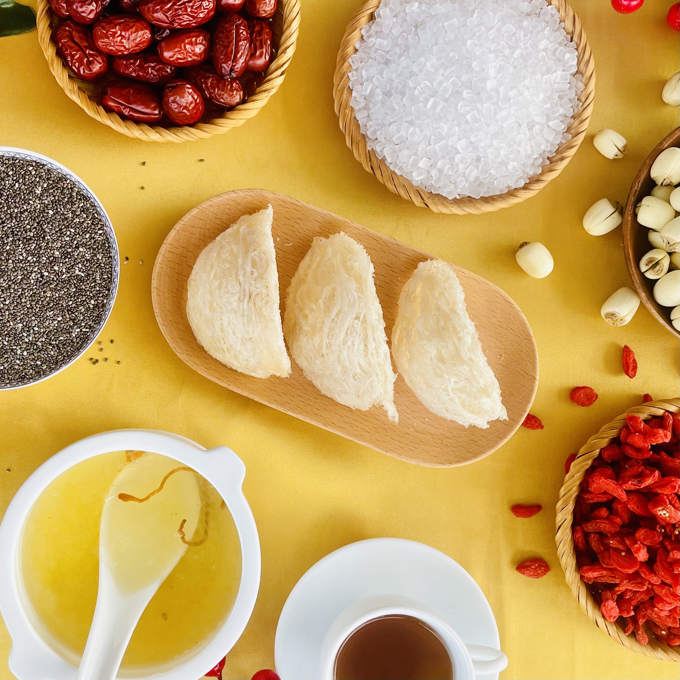 Quà tặng kèm: Bộ chưng yến tiện lợi gồm táo đỏ, đường phèn và hạt chia, giúp bạn chế biến món yến ngon bổ dưỡng mỗi ngày.