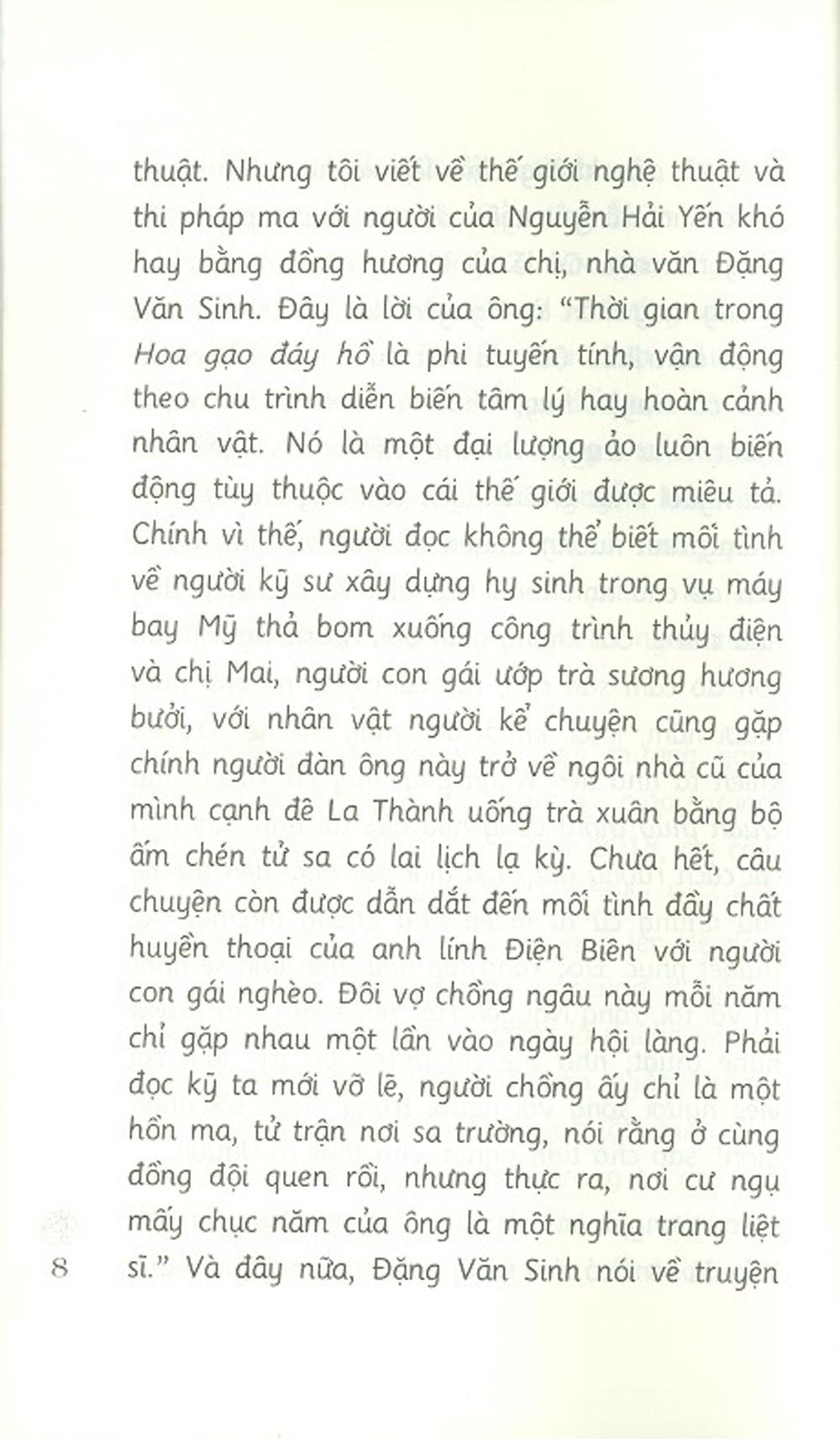 “…Những ngón tay run run chạm khẽ vào chiếc ấm đất, màu men tím thẫm ngả sang ánh tối rồi dựng lại ở vệt trắng mờ cong cong như cánh hoa khô… Nó chỉ dùng pha duy nhất một loại trà… Đây là chiếc ấm đất Tử Sa nhưng pha thêm chút tro hoa bưởi… Trà xuân núi Ngọc ướp hương bưởi rừng Thung Mây không chỉ thơm mùi hoa mà còn tròn nguyên vị sương của núi, nó chát đằm mà mượt như lụa, vừa nồng nàn hối hả như thời gian hữu hạn, lại êm và ngọt lửng lơ lững thững như khí xuân chưa muốn giao mùa…” (Trích Hoa gạo đáy hồ).