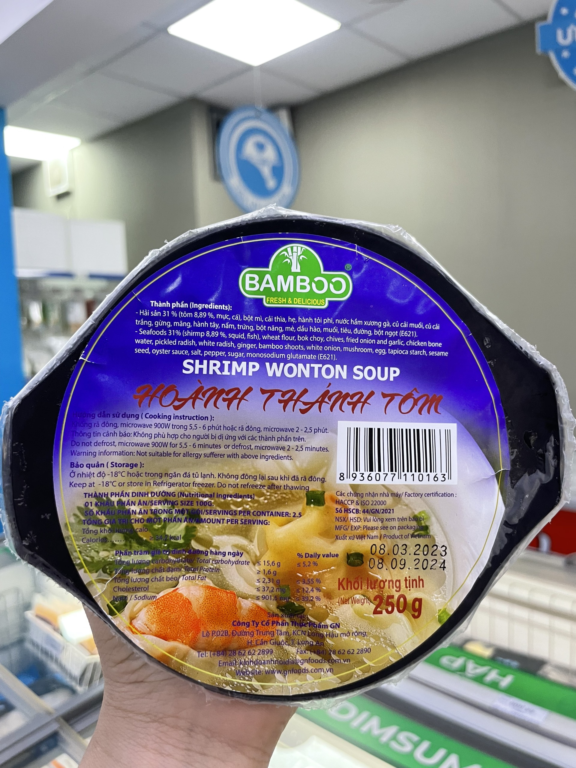 Với sản phẩm tươi sống, trọng lượng thực tế có thể chênh lệch khoảng 10%. ĐỊNH LƯỢNG: (15g/cái x 6 cái/gói) + (110g soup + 50g rau) THÀNH PHẦN: Tôm, mực, nấm đông cô, vỏ bột hoành thánh MÔ TẢ SẢN PHẨM: Vỏ màu vàng, mỏng, mềm với phần nhân từ tôm và nấm bên trong CÁCH CHẾ BIẾN: - Không rã đông, microwave 900W trong 5.5-6 phút - Rã đông, microwave 2-2,5 phút BẢO QUẢN: - Giữ đông từ -15 đến -18°C. Không đông lại sau khi rả đông - Bảo quản mát từ 0°C đến 5°C trong 3 ngày HSD: 12 tháng