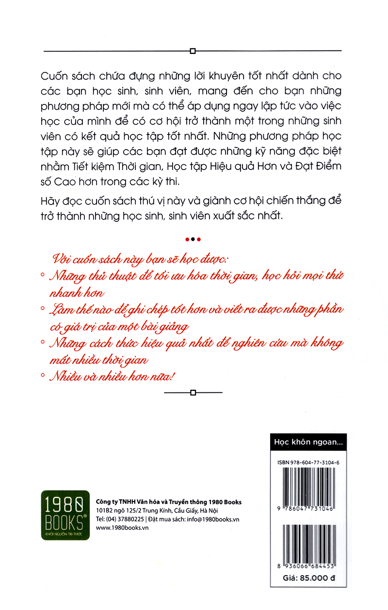 Học Khôn Ngoan Để Dẫn Đầu Cuốn sách chứa đựng những lời khuyên tốt nhất dành cho các bạn học sinh, sinh viên để bạn học được những phương pháp mới mà có thể áp dụng ngay lập tức vào việc học của mình để có cơ hội trở thành một trong những sinh viên có kết quả học tập tốt nhất. Những phương pháp học tập này sẽ giúp các bạn đạt được những kỹ năng đặc biệt nhằm Tiết kiệm Thời gian, Học tập Hiệu quả Hơn và Đạt Điểm số Cao hơn trong các kỳ thi. Với cuốn sách này, bạn sẽ học được: