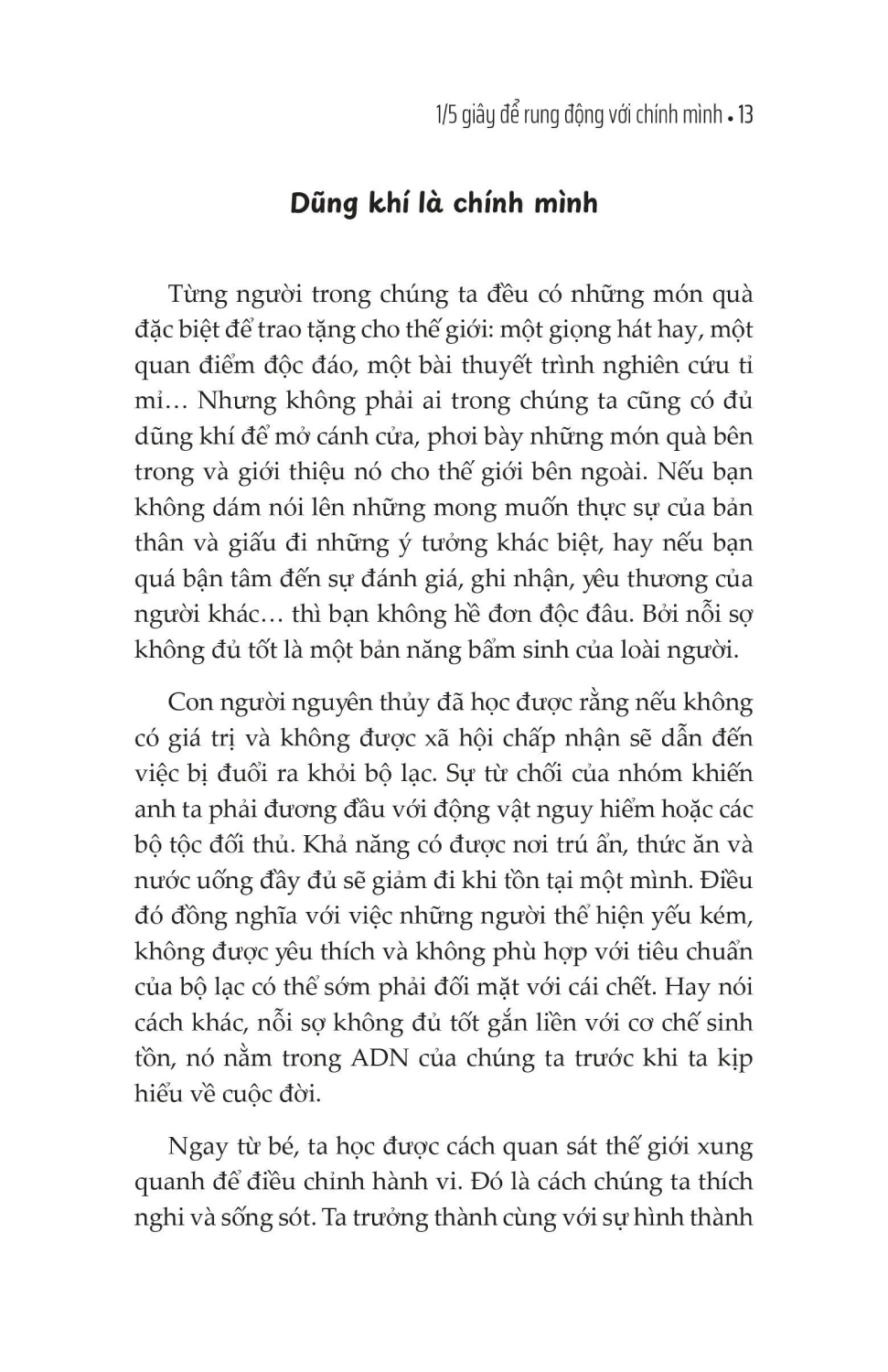 - Chạm vào những tổn thương từ lâu không dám đối diện là điều ai cũng phải trải qua để sống thật với chính mình, để biết cách ôm lấy bản thân và có một nội tâm vững vàng. Cuốn sách “1/5 giây để rung động với chính mình - Học thương mình giữa muôn vàn vụn vỡ” sẽ cổ vũ bạn yêu thương bản thân để trở thành phiên bản rực rỡ và trọn vẹn. Công ty phát hành Time Books Tác Giả Thạc Sĩ Thanh Alice Kích Thước 20 x 13 cm Năm Xuất Bản 2024 Số Trang 200 Nhà Xuất bản Thế Giới Bìa Mềm