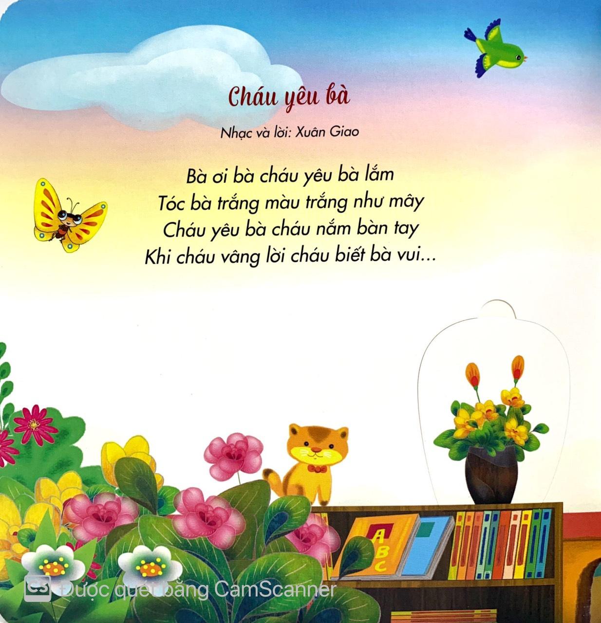 Mua tại TiktokTình cảm gia đình được thể hiện qua các bài hát như “Cháu yêu bà”, “Cả nhà thương nhau”, “Bàn tay mẹ”, “Bố là tất cả”, “Ba ngọn nến lung linh”… Trẻ nhỏ khi học hát những ca khúc ấy sẽ vừa cảm nhận rõ tình yêu thương giữa các thành viên trong gia đình, vừa hình thành vốn từ vựng xoay quanh chủ đề gia đình. Sau mỗi bài hát là phần câu hỏi đặt ra để bé phát triển tư duy. Chẳng hạn, ở ca khúc “Ba ngọn nến lung linh”, bé sẽ phải trả lời các câu hỏi như: Các màu sắc tương ứng với từng cây nến, Đối với bé thì gia đình là nơi như thế nào?