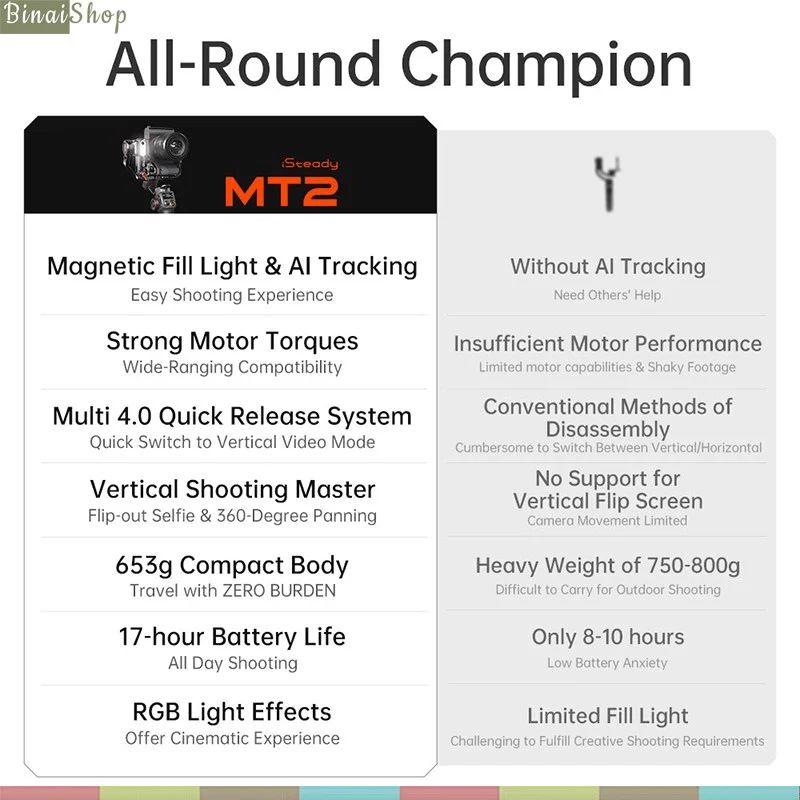 - Gimbal chống rung Hohem Isteady MT2 / MT2 KIT được thiết kế "4 in 1" tương thích với smartphone, camera action, máy ảnh cỡ nhỏ và DSLR. Sử dụng thuật toán chống rung isteady 7.0 mới nhất, hệ thống nhả nhanh Multi 4.0 chuyển đổi chế độ chụp ngang dọc nhanh chóng, cùng với đó là 3 trục động cơ mạnh mẽ tải trọng lên đến 1.2kg mang lại những thước phim mượt mà. TÍNH NĂNG CƠ BẢN
