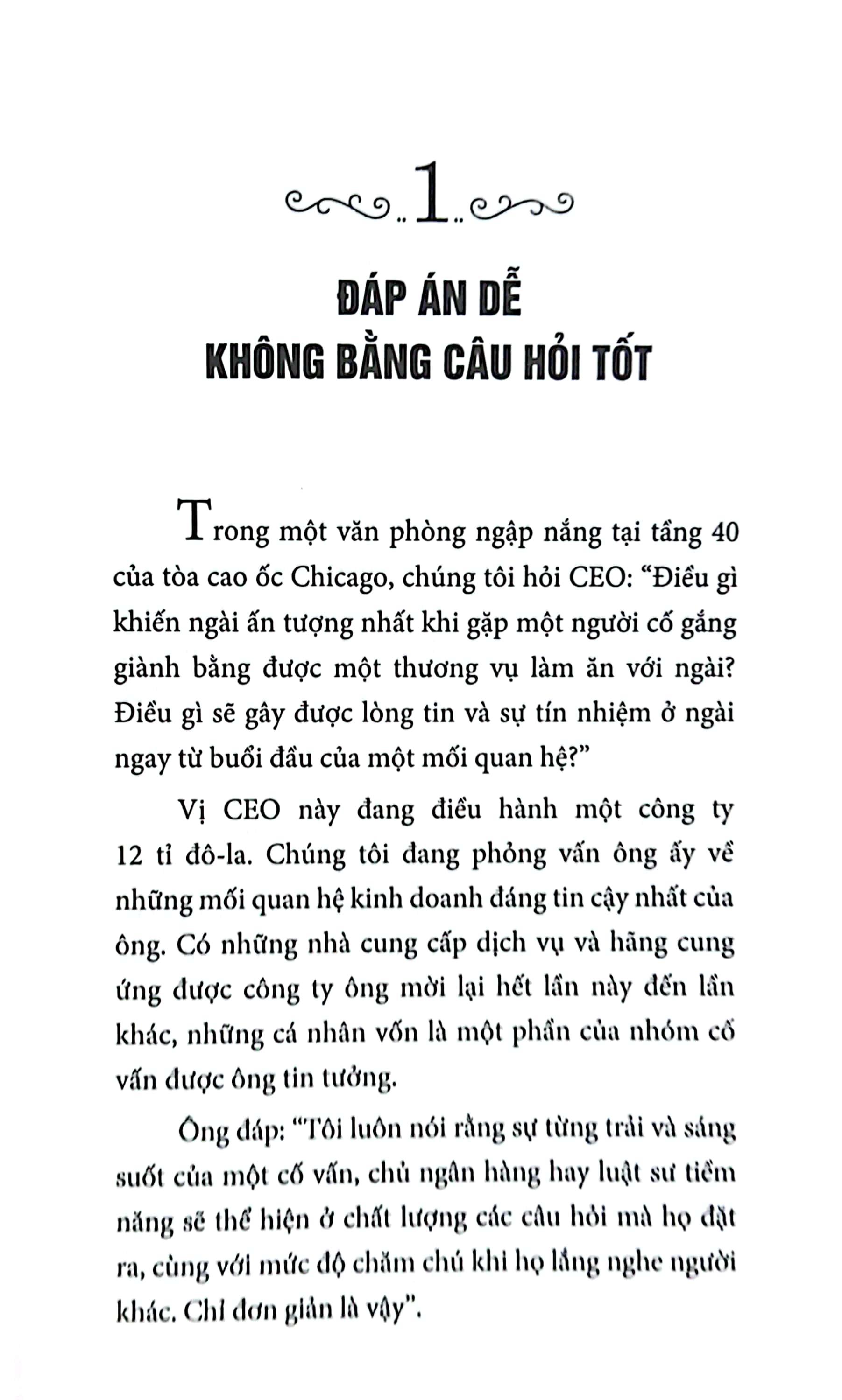 Hỏi Thông Minh - Đáp Cực Đỉnh Chúng ta đều cố gắng xây dựng những mối quan hệ đích thực với khách hàng, bạn bè và gia đình. Nhưng đôi khi chúng ta vẫn bị bế tắc và lúng túng. Hỏi thông minh, đáp cực đỉnh sẽ giúp bạn giải quyết tất tật những vấn đề đó bằng cách sử dụng các câu hỏi để thêm gia vị và ý nghĩa cho các cuộc trò chuyện, cũng như thắt chặt hơn các mối quan hệ. Giúp bạn làm được những việc sau một cách thật dễ dàng: