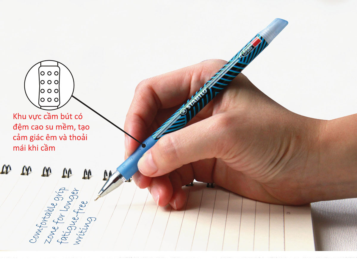 Đặc điểm: - Đầu bi: 0.5mm, sản xuất tại Thụy Sĩ. - Bút bi dạng bấm cò. - Nơi tì ngón tay có tiết diện hình tam giác vừa vặn với tay cầm giúp giảm