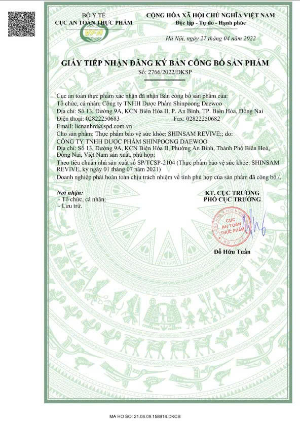 THỰC PHẨM BẢO VỆ SỨC KHỎE SHINSAM REVIVETHÀNH PHẦNMỗi viên nén bao phim (735mg) chứa:Bột Hồng sâm (Red Ginseng) 150 mg(Tương đương 0,9 mg Ginsenoside (Rg1 + Rb1 + Rg3))Chiết xuất Maca mg...