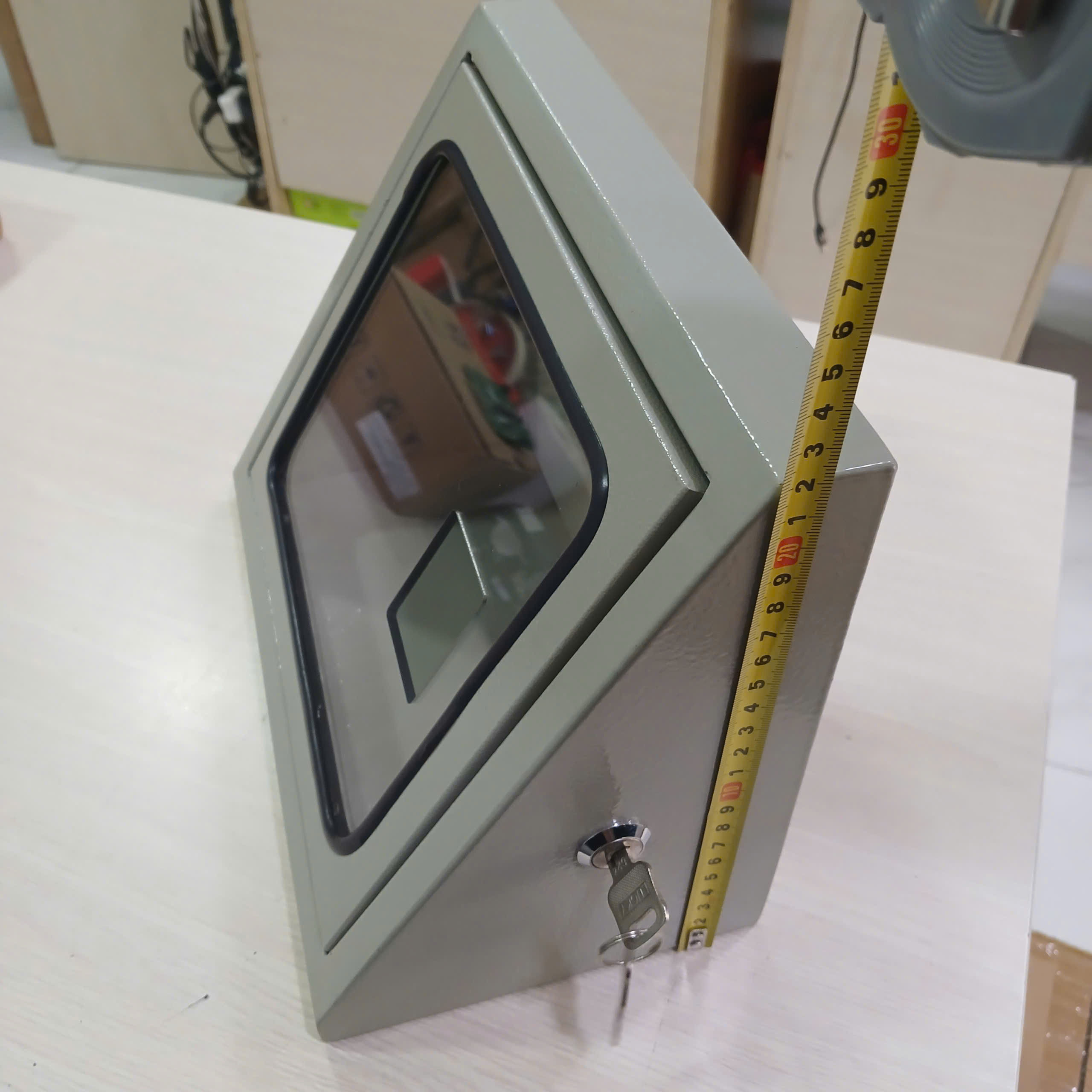 - Kiểu dáng hộp tam giác, kích thước nhỏ gọn, mặt lắp tấm mica trong suốt, tương thích với nhiều thiết bị kể cả máy chấm công và thiết bị kiểm soát cửa