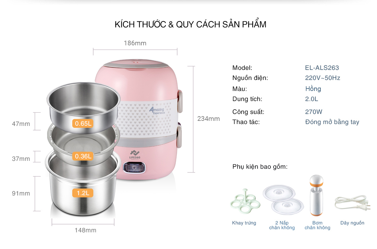 - Thiết Kế Tinh Tế: Màu tím trang nhã, kiểu dáng hiện đại, dễ dàng vệ sinh và bảo quản. Thông số kỹ thuật Hộp cơm cắm điện chân không 2 tầng Life360: Tên sản phẩm: Hộp cơm cắm điện Life360 Cấu tạo: 2 tầng, 3 khay inox (1 lớn, 1 trung, 1 nhỏ) Chất liệu: Inox 304, nhựa PP, nhựa PC Công suất: 270W Điện áp: AC220V - 50Hz Dung tích: 2 lít Trọng lượng sản phẩm: 1.25kg Kích thước sản phẩm: 186 x 172 x 234 (mm) Màu sắc: Tím và Hồng Bảo hành: 12 tháng Hướng dẫn sử dụng: