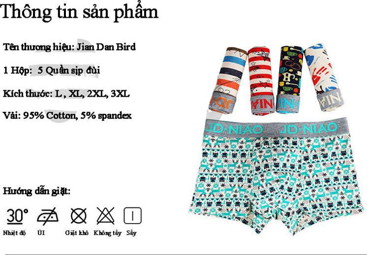 GIỚI THIỆU QUẦN SỊP ĐÙI NAM, QUẦN BOXER 95% COTTON 5% SPANDEX CỰC CHẤT **GIÁ TRÊN ĐÃ BAO GỒM 5 CHIẾC QUẦN SỊP ĐÙI NAM Size L(54-65kg), XL(66-77kg), XXL(78-89kg), 3XL( 90-100kg) Quần sịp đùi nam, quần boxer chất vải cao cấp, siêu mềm, co giãn cực tốt. Quần sịp đùi nam, quần boxer in hình họa tiết nhiều màu bắt mắt đầy phong cách, tạo sự khác biệt cho người mặc. Thun cạp chất liệu cực mềm thoải mái khi mặc. Từ khóa: Quần sịp; quần tam giác; quần sịp tam giác; quần lót nam;