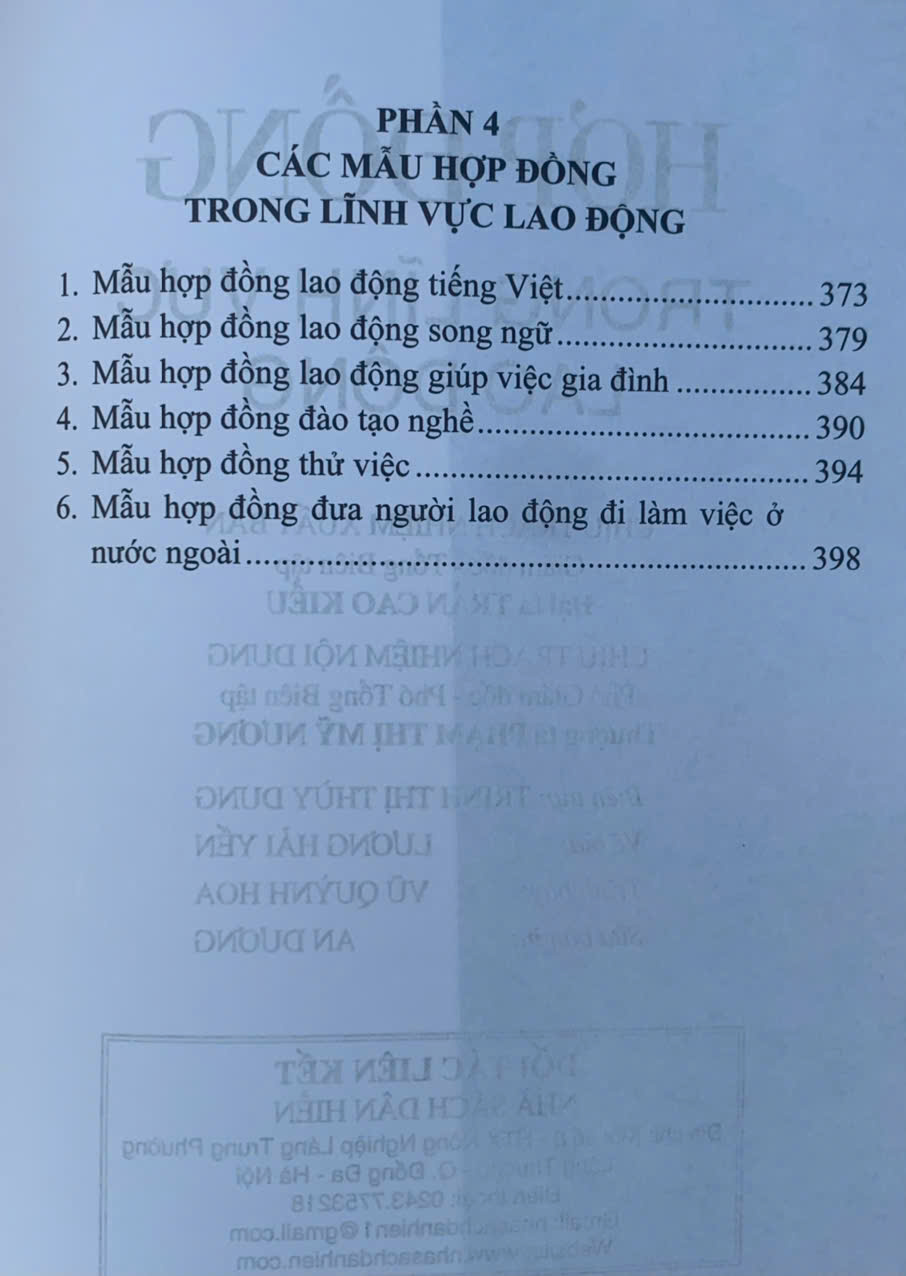 • Phần 4: Các mẫu hợp đồng trong lĩnh vực lao động. Mặc dù đã có nhiều cố gắng song cuốn sách khó tránh khỏi những khiếm khuyết, Nhà xuất bản Công an nhân dân và tập thể tác giả mong nhận được ý kiến đóng góp của bạn đọc để cuốn sách hoàn thiện hơn trong những lần xuất bản sau.