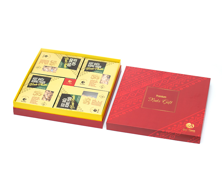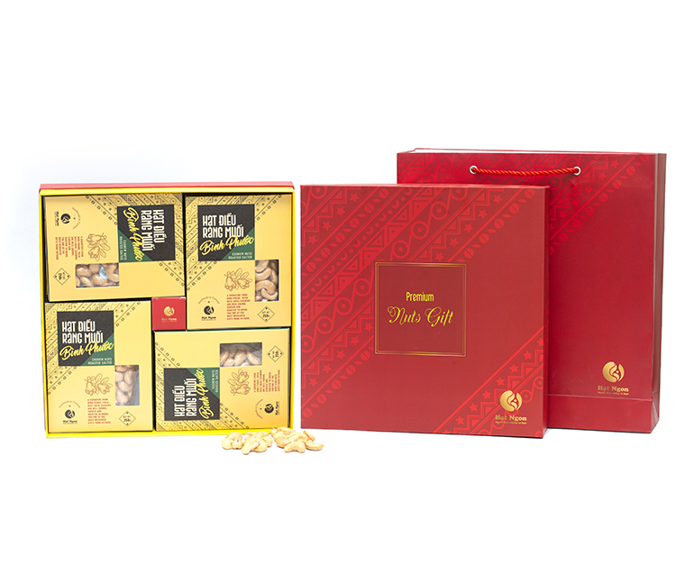 Hiểu được tâm lý của người tặng cũng như người nhận quà, chúng tôi không chỉ chú trọng tới chất lượng của món quà mà còn rất quan tâm tới hình thức bên ngoài. Hộp quà của bạn được đặt thiết kế đặc biệt, chú trọng từng đường nét, đảm bảo sự sang trọng, bộ sản phẩm bao gồm 4 hộp hạt dinh dưỡng gồm hạt Điều Bình Phước, Hạt Macca nứt vỏ tự nhiên, hạt hạnh nhân, hạt dẻ cười đỏ hy lạp.
