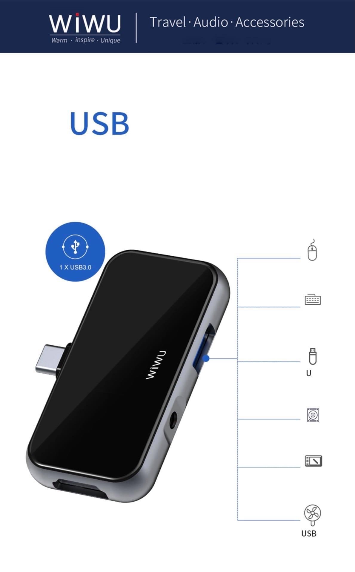 - Kích thước sản phẩm: 70 34,5 11mm Wiwu Alpha T5 Pro là một bộ chuyển đổi dùng để kết nối một số deyice hoặc phụ kiện với thiết bị của bạn như ổ USB Flash, chuột usb đến tai nghe 3.5mm . Nó cũng có thể được sử dụng để truyền dữ liệu với sự hiện diện của usb3.0 với khả năng truyền giữ liệu nhanh chóng , tốc độ , vận tốc