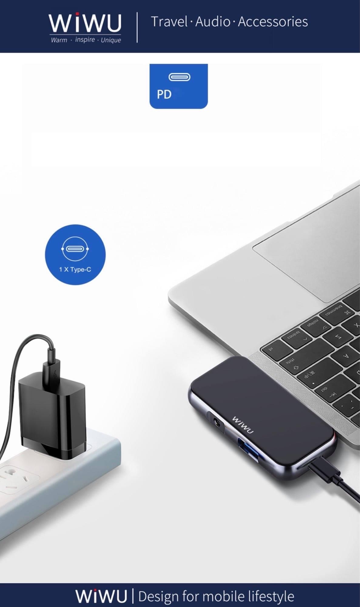 Hub WiWu Alpha 4 in 1 USB-C T5 Pro 1. Thương hiệu : WiWu 2. Mô tả sản phẩm - Thiết kế 4 trong 1: USB3.0 + HDMI + PD + giắc cắm 3,5 mm