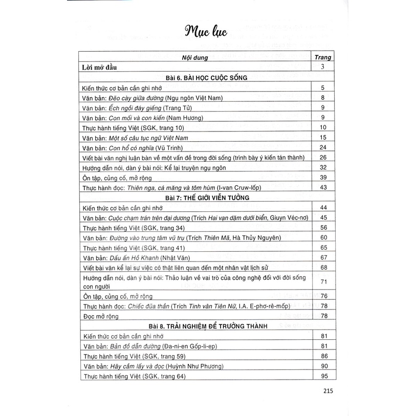 Nội dung gồm có: Bài 6: Bài học cuộc sống Bài 7: Thế giới viễn tưởng Bài 8: Trải nghiệm để trưởng thành Bài 9: Hòa điệu với tự nhiên Bài 10: Trang sách