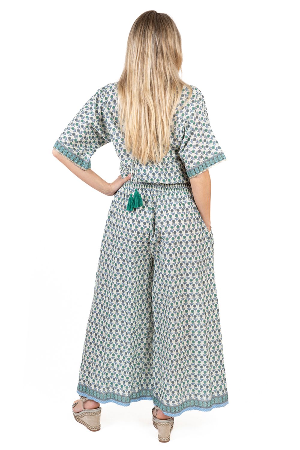 Jumpsuit Trễ Vai Isla Bonita, chất lụa mềm mại, nền vải vẽ ánh kim tinh tế. Vai thun co giãn, có thể mặc trễ vai hoặc kín vai. Có 2 túi phía sau. Lưng thun