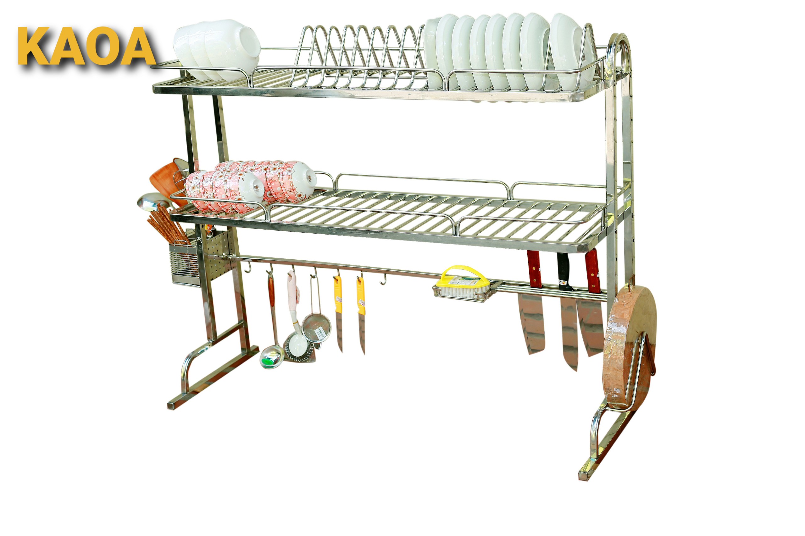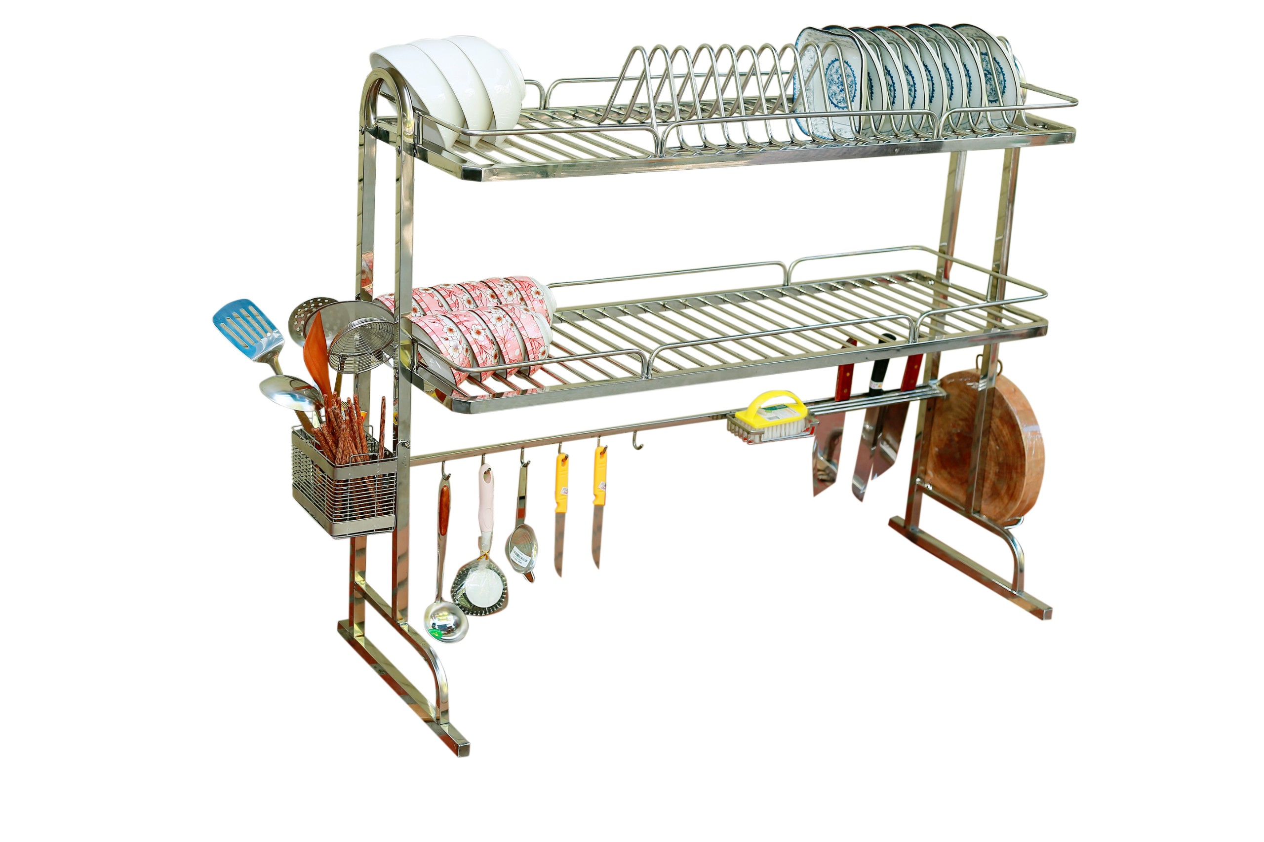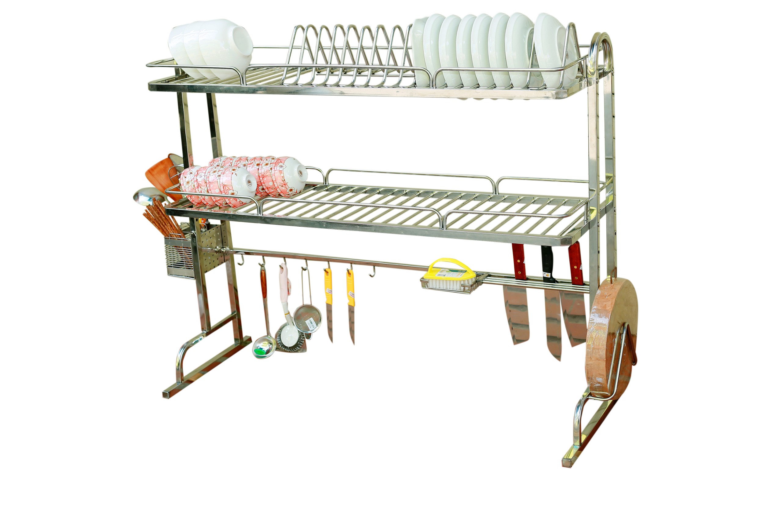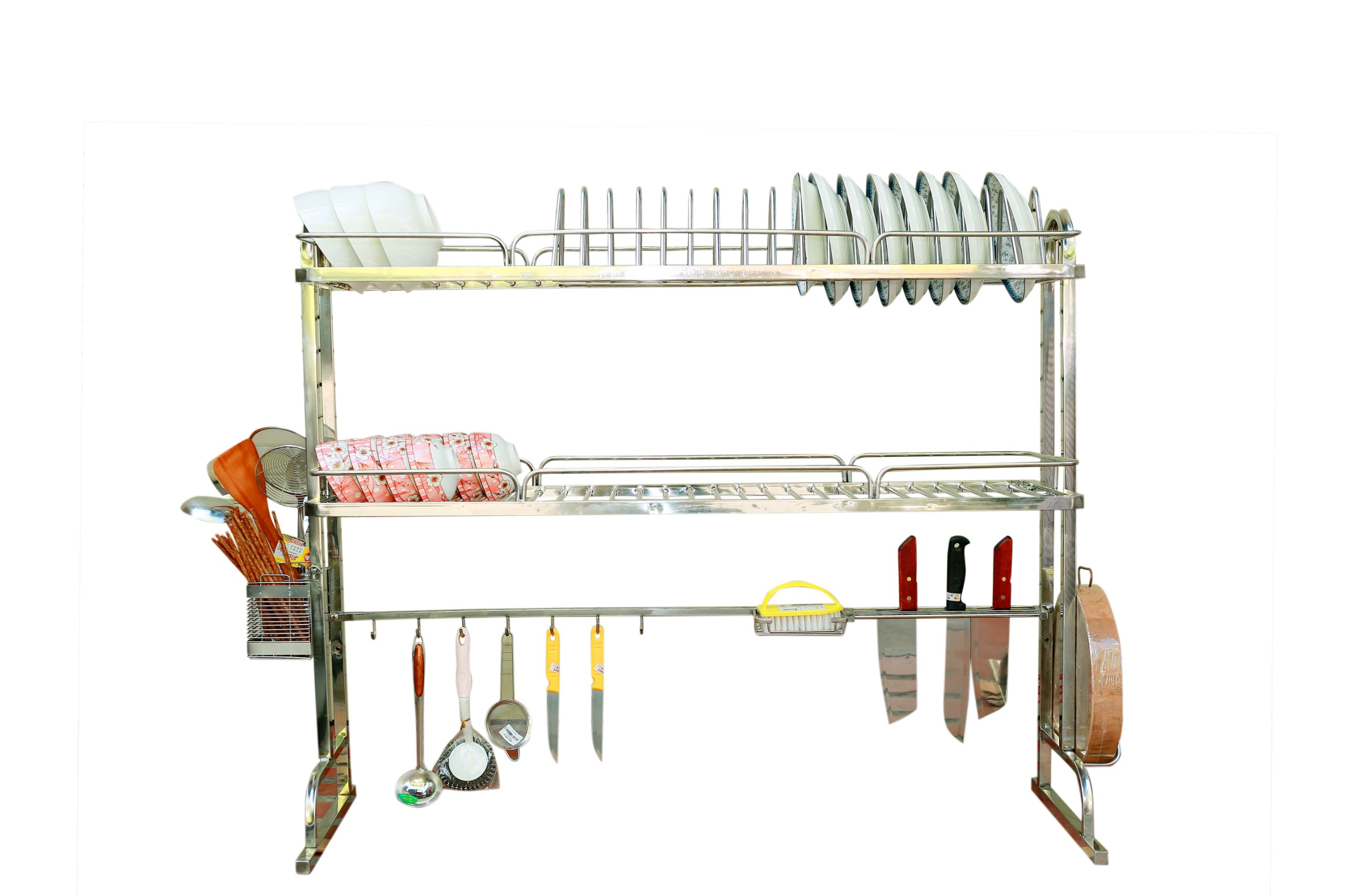 - Bộ sản phẩm đày đủ: Kệ để chén đĩa, giá để dao đũa thìa, giá để thớt, giá để nước rửa bát, khăn lau bát, 6 móc treo nồi.