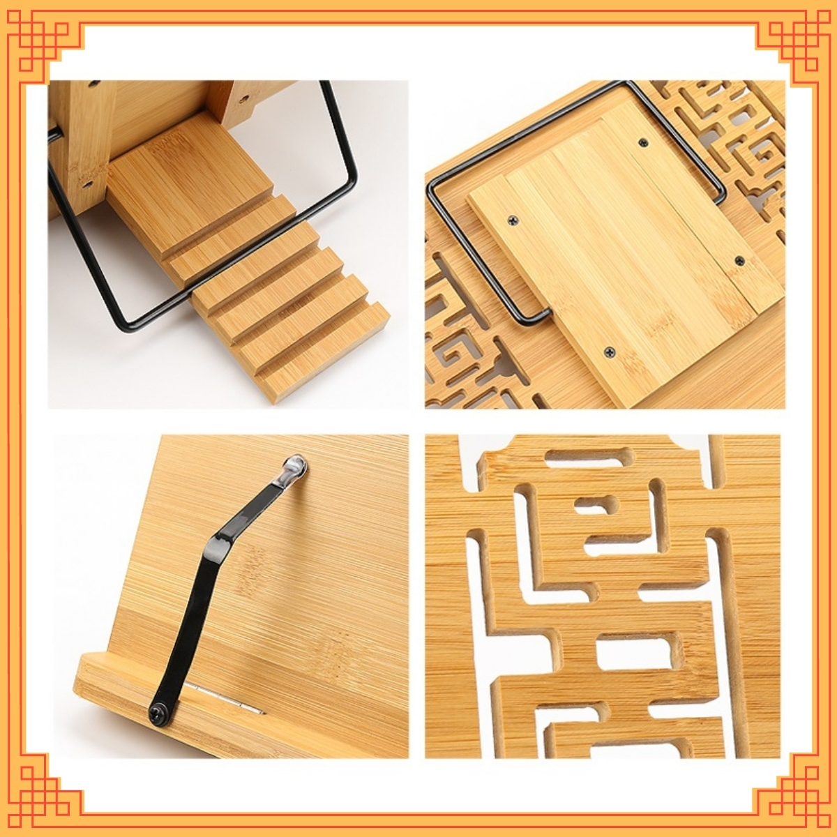 - Chân đế bằng gỗ tre ép, có 7 rãnh giúp điều chỉnh độ nghiêng của sách phù hợp với các tư thế đọc khác nhau.
