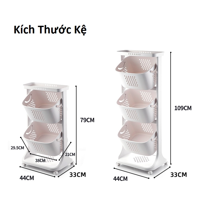 - Màu sắc nhã nhặn, thiết kế tinh tế, phù hợp để ở nhiều góc trong gia đình. Màu sắc Kệ có 4 màu: trắng, xám, hồng, xanh Chất liệu Nhựa PP cao cấp, tuyệt đối an toàn cho sứ khỏe Kích thước Kệ 2 tầng: 44Cm X 33Cm X 79Cm Kệ 3 tầng: 44Cm X 33Cm X 110Cm Kích thước giỏ tầng 1: 29,5Cm X 38Cm X 35Cm Kích thước giỏ tầng 2, tầng 3: 29,5Cm X 38Cm X 21Cm