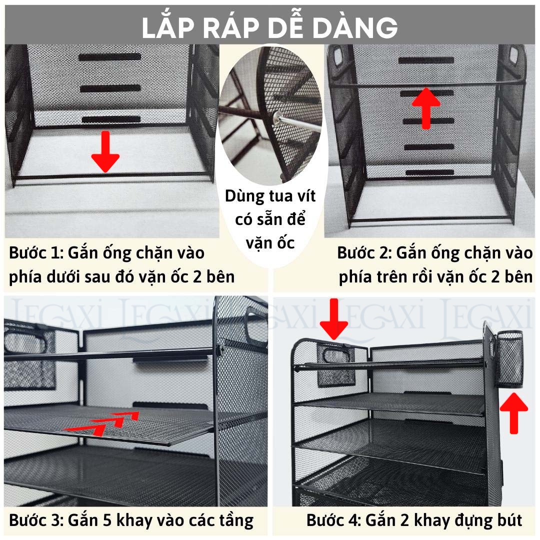 - Các khay có thể kéo ra dễ dàng, thuận tiện cho việc tìm đồ, tài liệu, hồ sơ, HƯỚNG DẪN LẮP RÁP Bước 1: Dùng tua vít gắn vít vào ống chặn ở phía dưới. Bước 2: Dùng tua vít gắn vít vào ống chặn ở phía trên. Bước 3: Gắn 5 khay lưới vào các tầng. Bước 4: Gắn ngăn kéo và 2 khay đựng bút vào kệ hoặc để bên ngoài tuỳ thích.
