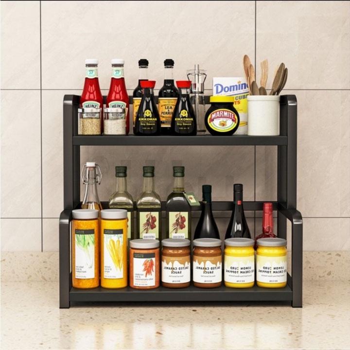 - Kệ có thiết kế 2 tầng tùy thuộc vào nhu cầu và sở thích mà bạn có thể lựa chọn cho phù hợp. (Tầng dưới để các chai lọ cao như mắm, dầu , tầng trên để các loại lọ thấp như muối, hạt nêm, gia vị khác ). -Kệ gia vị khi sắp xếp sẽ biến căn bếp nhà bạn giống Vương Quốc gia vị thu nhỏ.