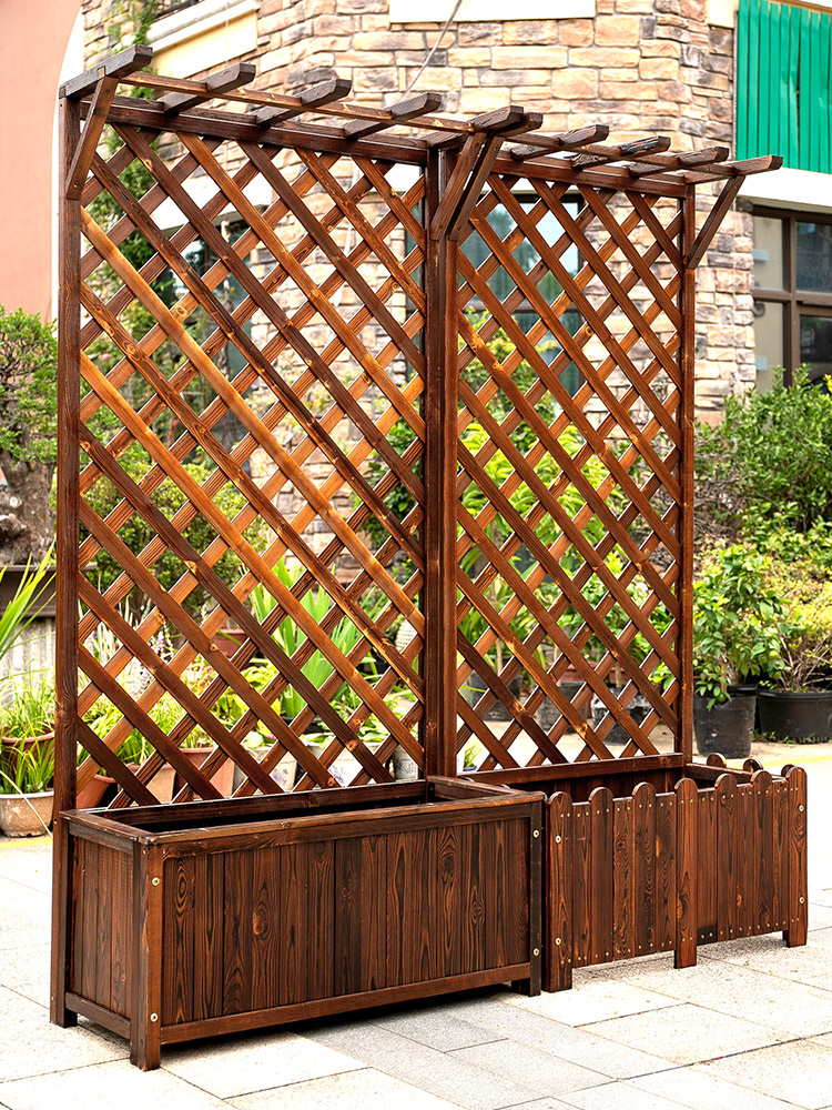 Kệ gỗ vách ngăn được làm từ gỗ thông tự nhiên, được xử lý cacbon hóa để chống mối mọt ẩm mốc, phù hợp để ngoài trời thời gian dài. Màu sắc gỗ tự nhiên tưới sánh thanh nhã