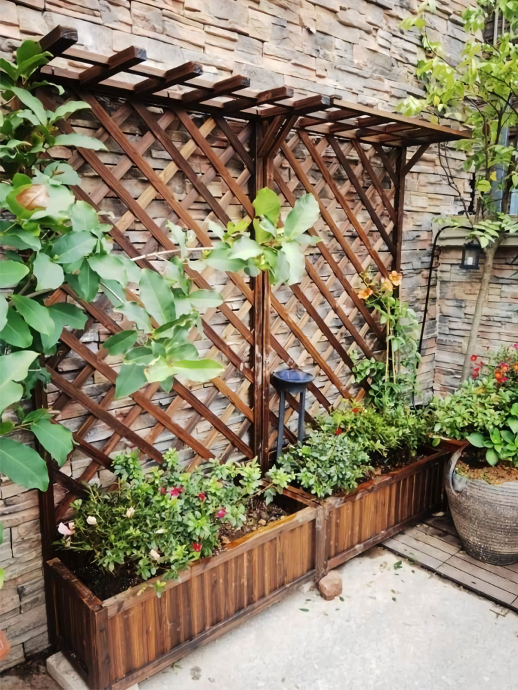 Kệ vách ngăn gỗ thông trang trí sân vườn, phòng khách, ban công có giá treo chậu hoa cây cảnh vintage