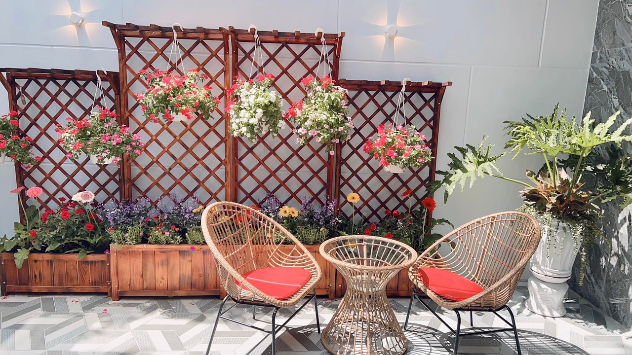 Kệ vách ngăn trang trí sân vườn mẫu mới nhất có thêm giá treo chậu cây và bồn để chậu hoa cây cảnh kiểu dáng vintage được sản xuất chuyên dụng để ngoài trời, đảm bảo chống cong vênh mối mọt.
