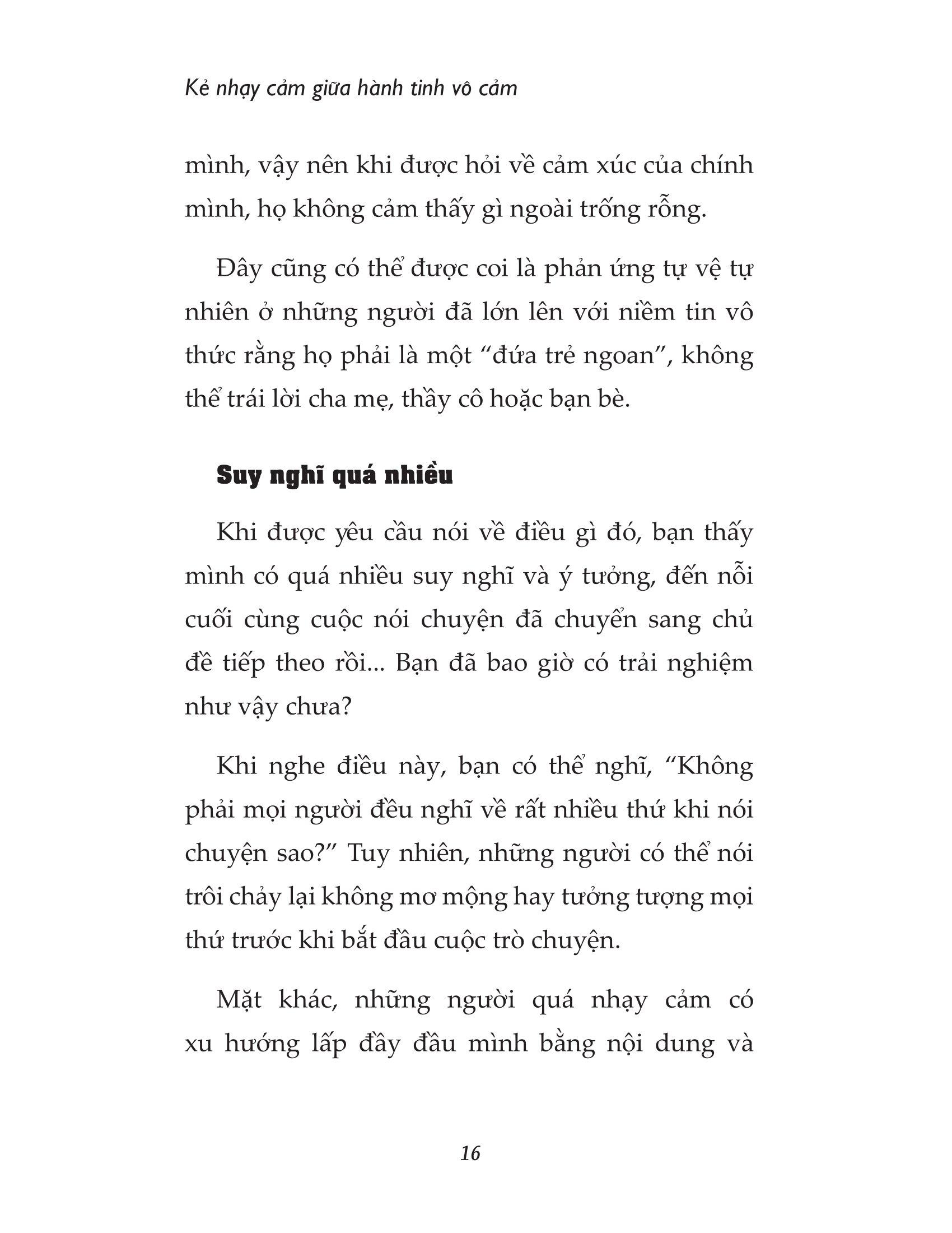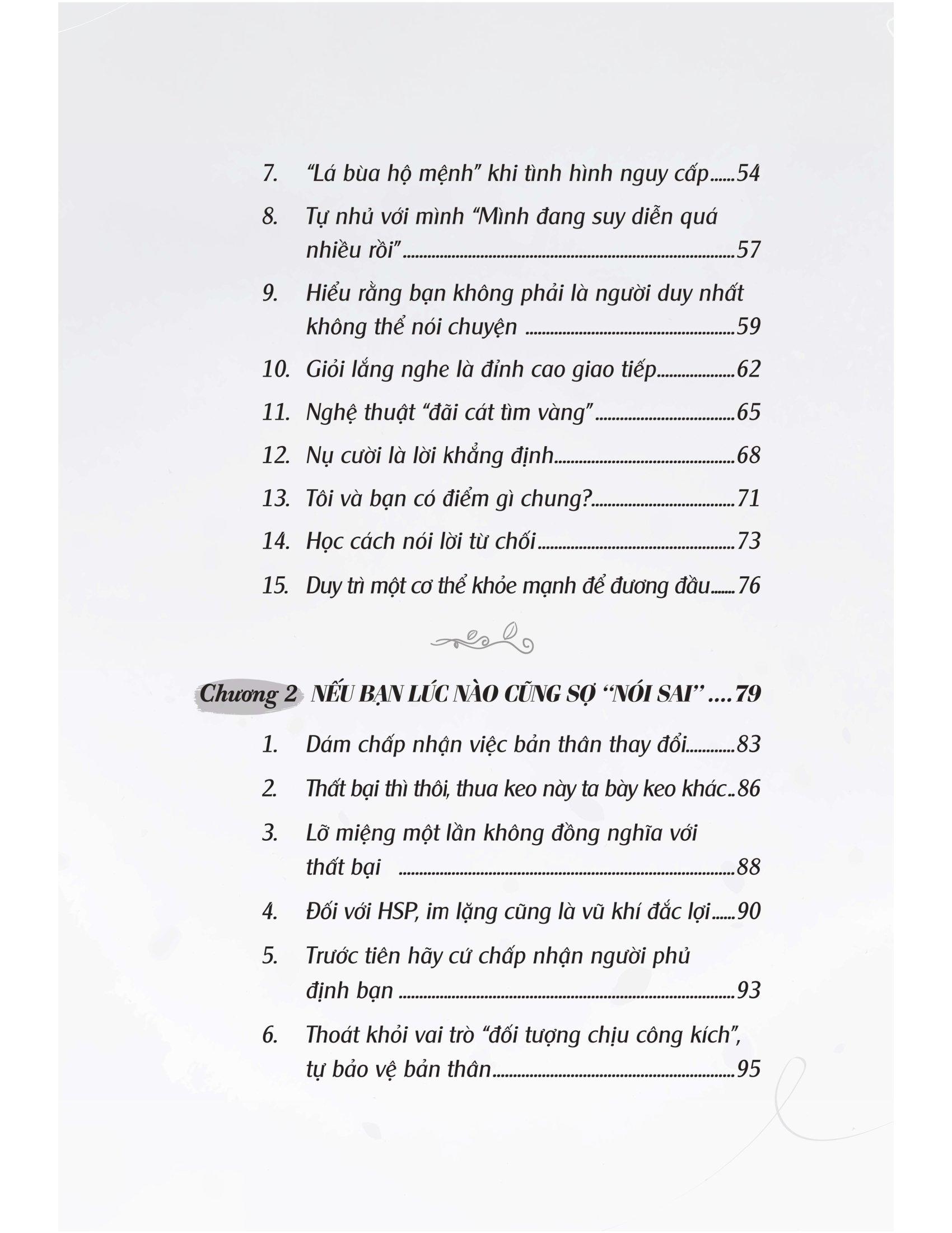 Nếu bạn muốn mở lòng hòa nhập với thế giới bên ngoài, cuốn sách “Kẻ nhạy cảm giữa hành tinh vô cảm” sẽ rất có ích cho bạn. Cuốn sách sẽ đưa ra những lời khuyên trò chuyện hiệu quả để các HSP có thể dễ dàng cất lên tiếng của bản thân, bao gồm cách “lắng nghe thay vì cố gắng ép m.ình nói” hay “phớt lờ những người chỉ biết nói những lời gây tổn thương”. Đặc biệt là lời nhắn “Đừng cố gắng để được mọi người yêu thích”. Đây là cuốn sách dành riêng để hỗ trợ những tâm hồn nhạy cảm, những người có xu hướng tự ti và nghĩ rằng m.ình không có giá trị; thêm yêu bản thân và tự tin vào chính m.ình.