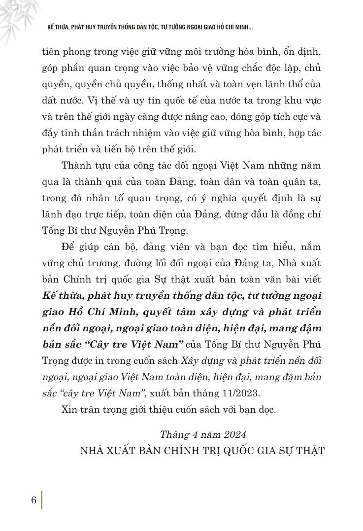✨Kế thừa, phát huy truyền thống dân tộc, tư tưởng ngoại giao Hồ Chí Minh, quyết tâm xây dựng và phát triển nền đối ngoại, ngoại giao toàn diện, hiện đại, mang đậm bản sắc "cây tre Việt Nam'' (bản in 2024)