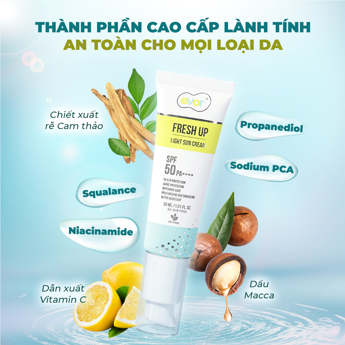 ✨Kem chống nắng makeup trẻ hoá dưỡng trắng - Fresh Up Light Sun Cream 30ml | EVOR