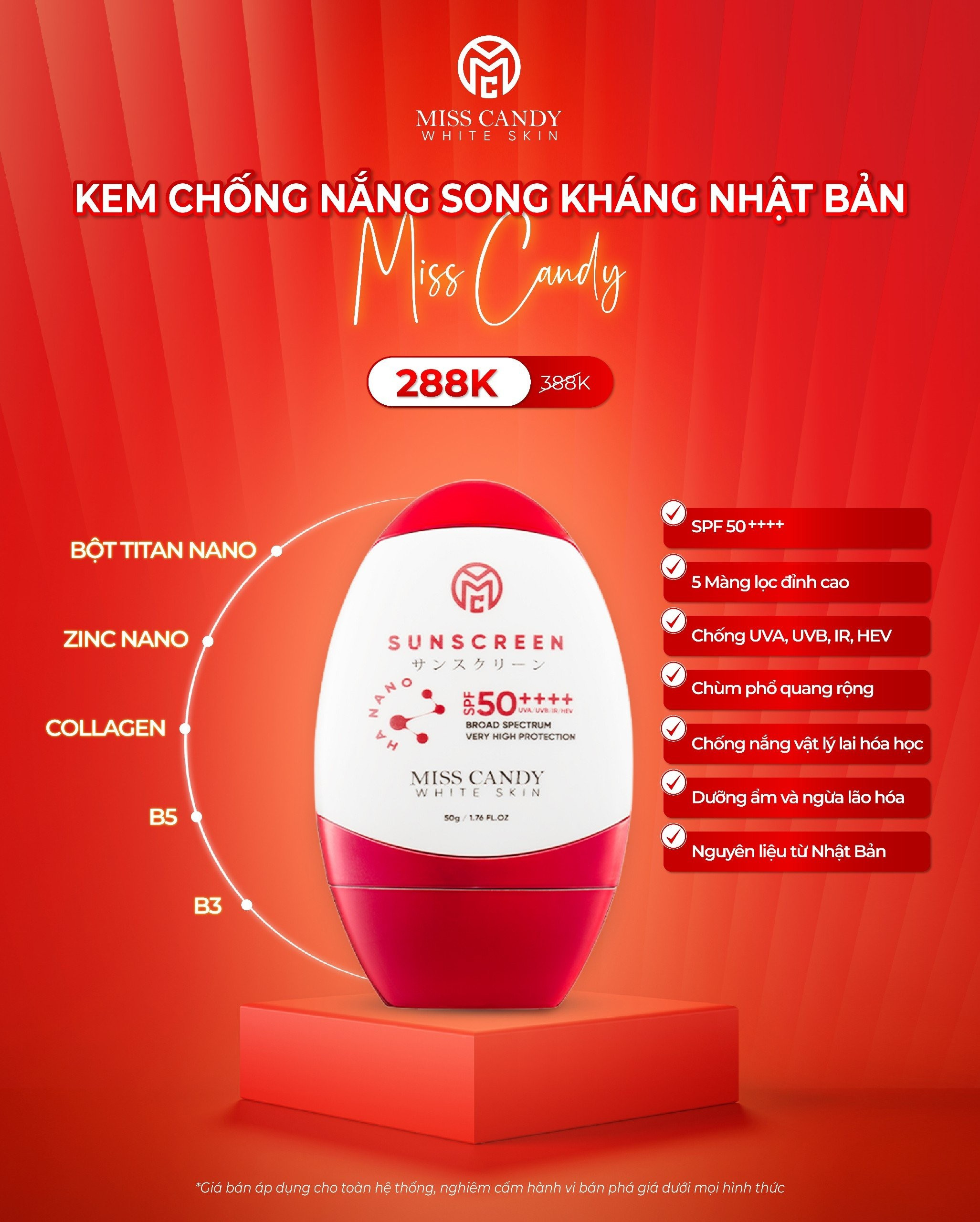 Mua tại TiktokKem Chống Nắng Song Kháng Nhật Bản MISS CANDY SUNSCREEN HA NANO SPF 50,PA ++++ 50g, Chống Nước, Chống UVA/UVB, Chống Ánh Sáng Xanh & Tia Hồng Ngoại,Bảo Vệ Da Lên Đến 8 Tiếng - Gia Tuệ House THÔNG TIN SẢN PHẨM