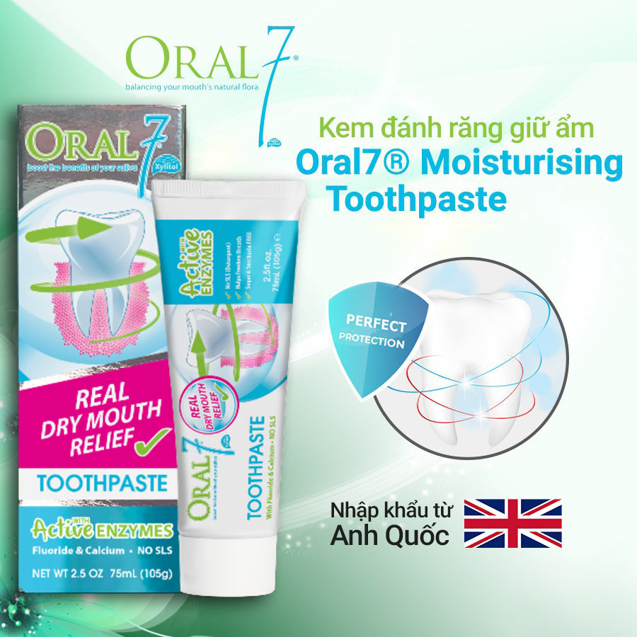 Kem đánh răng dành cho người khô miệng, viêm lợi, tạo nước bọt nhân tạo Oral7 Toothpaste giúp trung hòa độ acid, duy trì cân bằng hệ sinh thái trong miệng với những enzyme tự nhiên kết hợp với tác dụng tăng cường và tái khoáng hóa men răng hiệu quả của Fluoride và Calcium.