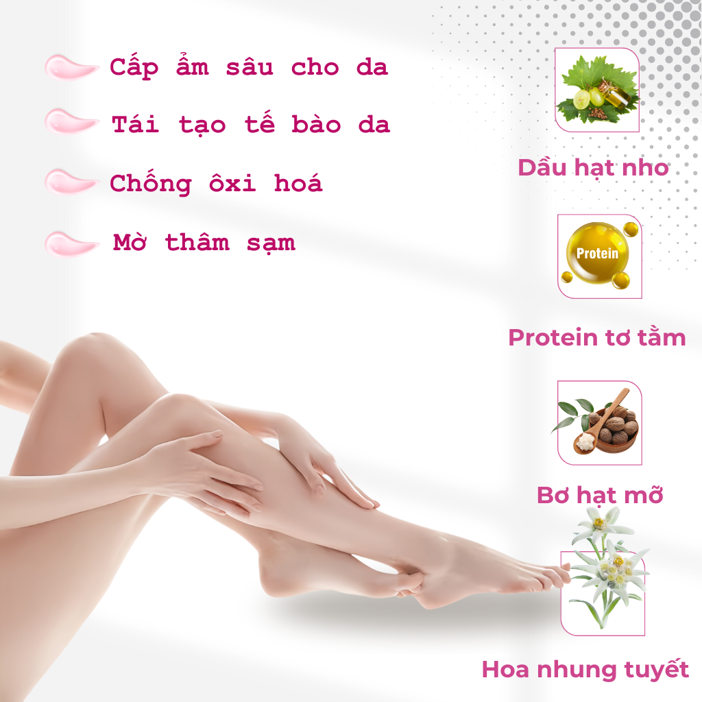 Kem Dưỡng Thể Trắng Da Nâng Tone Tăng Cường POP Sử dụng sữa dưỡng thể trắng da mỗi ngày là phương pháp đang được rất nhiều bạn trẻ lựa chọn để có được làn da trắng sáng, khoẻ mạnh. Kem dưỡng thể trắng da nâng tone POP chứa các hoạt chất dưỡng trắng tăng cường niacinamide 5% và alpha-arbutin 0.3% cùng với thành phần thiên nhiên chiết xuất từ dầu hạt nho, hoa nhung tuyết, protein tơ tằm, … mang đến cho bạn giải pháp dưỡng da chuyên sâu, hoàn hảo: Dưỡng trắng da tự nhiên, làm mờ các vết thâm sạm: chứa các thành phần hoạt tính tăng cường và dưỡng chất từ thiên nhiên chọn lọc giúp làm giảm sắc tố melanin trên da, ngăn ngừa sự hình thành của vết thâm do cháy nắng để lại, chống lại những vết thâm sạm, đốm đen giúp cho làn da của bạn được trắng sáng, mịn màng hơn. Giúp tái tạo làn da: hỗ trợ tẩy tế bào chết trên da, loại bỏ được những vùng da khô cứng và hấp thụ dưỡng chất một cách dễ dàng, giúp thúc đẩy khả năng tái tạo tế bào da mới để làn da của bạn luôn được căng bóng, mịn màng và tràn đầy sức sống. Cân bằng độ ẩm cho da: cung cấp độ ẩm cần thiết cho làn da của bạn, duy trì và cân bằng độ ẩm từ sâu bên trong giúp làn da của bạn luôn được mịn màng và không bị khô sần. Tăng cường độ đàn hồi: chứa các vitamin và chất chống oxy hóa giúp ngăn ngừa tình trạng lão hóa. Ngoài ra, còn giúp da tái tạo collagen nhằm tăng cường độ đàn hồi và săn chắc cho làn da. Nâng tone nhanh, hiệu quả dưỡng trắng nổi bật: công thức chuyên sâu của POP với các thành phần dưỡng trắng da tăng cường giúp làn da của bạn trắng sáng tự nhiên và bật tone ngay sau lần đầu sử dụng. Thành phần chính: Niacinamide: Có tác dụng làm sáng và đều màu da, giúp da trở nên rạng rỡ và tươi trẻ, làm giảm sự sản sinh melanin, làm mờ các vết thâm, nám và tàn nhang. Đặc biệt là Niacinamide còn có khả năng kích thích quá trình tái tạo tế bào da, loại bỏ các tế bào chết và sừng hóa, giúp da trở nên sáng khỏe và đều màu. Niacinamide có tác dụng đẩy nhanh quá trình phục hồi da bị tổn thương bởi ánh nắng mặt trời, cải thiện cấu trúc da, chống lão hoá da hiệu quả, duy trì độ ẩm cho da và củng cố lại hàng rào bảo vệ da bảo vệ làn da khỏi xâm nhập xấu từ môi trường bên ngoài. Niacinamide còn hoạt động tăng cường độ ẩm giữ nước cho làn da, hỗ trợ giảm tiết dầu thừa. Với tính kháng khuẩn cao niacinamide làm giảm sưng tấy do mụn gây ra, hạn chế mụn trứng cá, hỗ trợ giúp cho làn da luôn khỏe mạnh, mịn màng. Alpha-Arbutin: Ức chế enzyme sản sinh ra melanin (hắc sắc tố), làm giảm tình trạng sạm, nám, tàn nhang và quá trình lão hóa của da, giúp làn da của bạn được căng mịn, trắng sáng và tươi trẻ hơn. Bơ hạt mỡ : Thành phần bao gồm các chất béo không bão hòa với một tỷ lệ lớn, các axit béo thiết yếu, phytosterol, vitamin E và D, vitamin A và allantoin, một siêu thực phẩm cho làn da. Ngăn ngừa và hình thành nếp nhăn và chữa lành làm mờ vết sẹo. Chống lão hóa nhờ thành phần chất chống oxy hóa. Giúp da giữ ẩm sâu. Tăng khả năng dẻo dai của da. Dầu hạt nho: Có khả năng làm sạch và se khít các lỗ chân lông, loại bỏ độc tố và chất nhờn trong nang lông, củng cố màng tế bào và tăng cường độ đàn hồi của da, nhờ đó giúp giảm nhanh mụn và phục hồi tổn thương, thâm mụn lâu ngày. Dầu hạt nho có đặc tính chống oxy hóa mạnh. mang lại khả năng bảo vệ da khỏi các tác nhân gây hại từ môi trường. Ngoài ra, dầu hạt nho còn có khả năng cải thiện sắc tố da, giúp da được đều màu, mềm mịn và săn chắc hơn. Sericin (Protein tơ tằm): Là một loại protein do bombyx mori (tằm dâu) tạo ra trong quá trình sản xuất tơ. Sericin được chứng minh có thể cải thiện độ đàn hồi của da và chống nếp nhăn. Điều này được thực hiện bằng cách giảm thiểu sự mất nước từ da. Chiết xuất hoa nhung tuyết: Đây là thành phần rất giàu chất chống oxy hóa, giúp bảo vệ da khỏi tác hại của các gốc tự do và ngăn ngừa lão hóa sớm, giúp giữ ẩm và làm dịu làn da khô bị kích thích và nhạy cảm. Cùng với đó, các hoạt chất có trong hoa tuyết nhung còn có khả năng hạn chế sự xuất hiện của các vết đốm đen, thâm sạm và chứng tăng sắc tố da, giúp da được trắng sáng hơn. Ngoài ra, chiết xuất hoa nhung tuyết còn có đặc tính chống tia cực tím tự nhiên và có thể giúp bảo vệ da khỏi những tác hại của ánh nắng mặt trời. Thành phần đầy đủ: Aqua, Glycerin, Niacinamide, Paraffinum Liquidum, Caprylic/Capric Triglyceride, Titanium Dioxide, Dimethicone, Polyacrylamide, Butyrospermum Parkii Butter, Alpha-Arbutin, Vitis Vinifera Seed Oil, Sericin, Leontopodium Alpinum Extract, Menthol, C13-14 Isoparaffin, C9-11 Pareth-6, Polyacrylate Crosspolymer-11, Hydrogen Dimethicone, Benzophenone-5, Disodium EDTA, Citric Acid, Ethylhexylglycerin, Phenoxyethanol, Potassium Sorbate, Sodium Benzoate, Parfum, Aluminum Hydroxide, CI 15985. Sản phẩm được sản xuất tại nhà máy đ