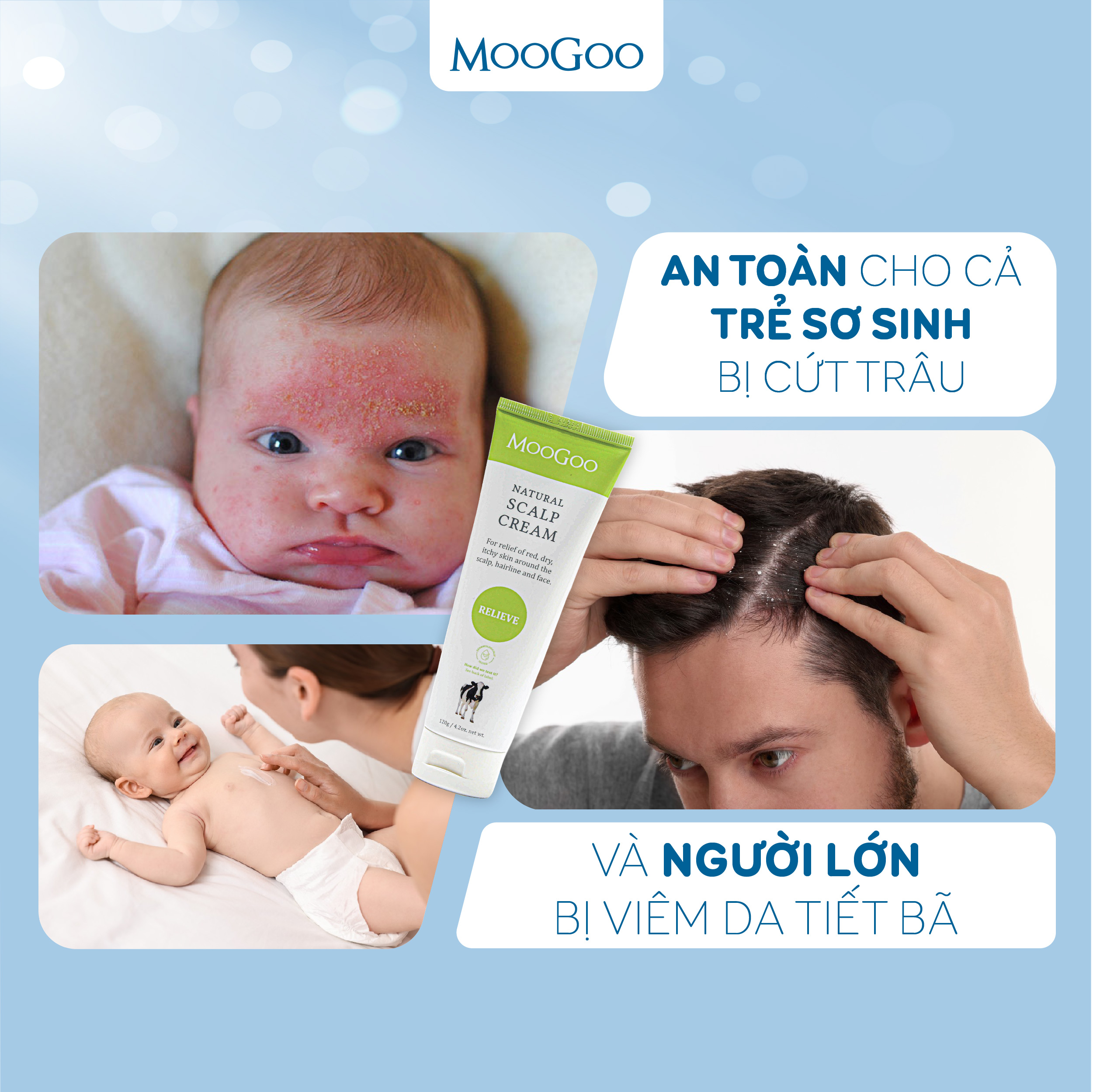 Kem dưỡng ẩm giữ ấm, hỗ trợ điều trị viêm da đầu tiết bã MooGoo Scalp Cream 120g là một sản phẩm dưỡng ẩm tự nhiên nhưng đồng thời được bổ sung các tác dụng chính giúp làm dịu, cải thiện tình trạng viêm da tiết bã nhờn và trả lại làn da khỏe mạnh ở các khu vực như vùng da đầu, chân tóc, cổ , cổ tay. cổ chân hoặc vùng da xung quanh mũi và miệng . Kem trị viêm da tiết bã MooGoo cho mọi lứa tuổi và kể cả trẻ sơ sinh, viêm da cơ địa