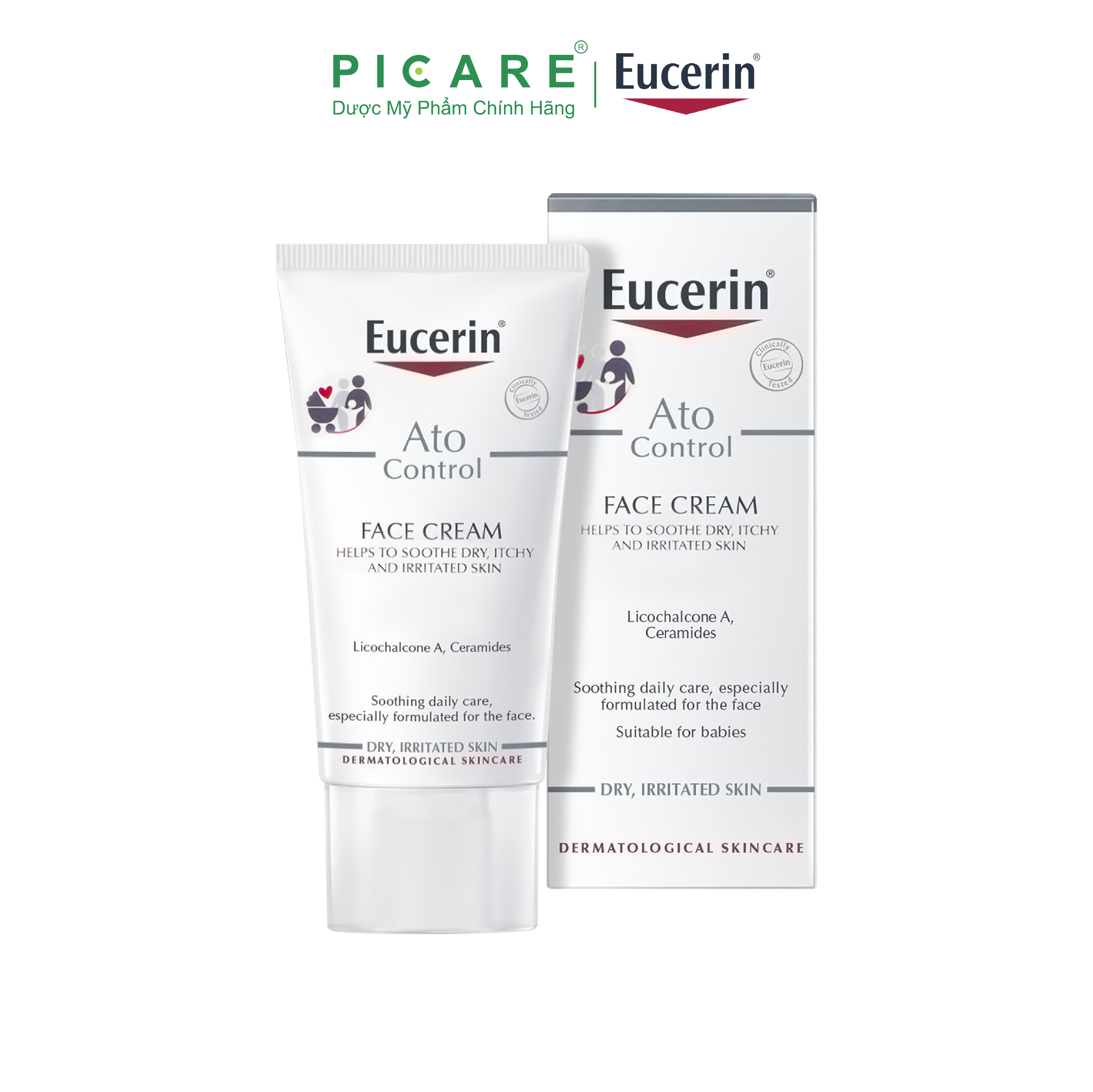 - Licochalcone a AtoControl Face Care Cream là loại kem dưỡng da mặt hàng ngày nhẹ nhàng, dễ dàng hấp thu, dùng cho các giai đoạn không bùng phát ("khoảng nghỉ"). Khi các cơn bùng phát xuất hiện, nên dùng kem dưỡng da mặt Eucerin AtoControl Face Care Cream hỗ trợ cho kem dưỡng Eucerin AtoControl Acute Care Cream. Với hàm lượng chứa 12% các acid béo Omega-6 giúp làm dịu, Licochalcone A giảm ngứa đỏ kem dưỡng Eucerin AtoControl Face Care Cream cung cấp độ ẩm, giảm tình trạng viêm ngứa của da. Sản phẩm đã qua kiểm nghiệm lâm sàng cho thấy phù hợp dùng cho da viêm do cơ địa và thích hợp cho trẻ em và trẻ sơ sinh trên 3 tháng tuổi. Cũng như mọi sản phẩm khác trong bộ sản phẩm Eucerin AtoControl, sản phẩm này không chứa chất bảo quản paraben, không màu hay hương liệu nhằm giảm thiểu nguy cơ gây kích thích và dị ứng cho da CÁC NGHIÊN CỨU LÂM SÀNG Nghiên cứu lâm sàng trên da cho thấy khả năng đáp ứng tốt đối với da người bệnh mắc viêm da do cơ địa. THÀNH PHẦN Aqua, Glycerine, Vitis Vinifera Seed Oil, Oenothera Biennis Oil, Caprylic/Capric Triglyceride,Cyclomethicone, Dimethicone, Pentaerythrityl Tetraisostearate, Triisostearin, Cetyl Alcohol,Glyceryl Stearate, PEG-40 Stearate, Glycyrrhiza Inflata Root Extract, Ceramide NP,Tocopherol, Ascorbyl Palmitate, Citric Acid, Sodium Citrate, BHT, 1,2-Hexanediol, Decylene Glycol, Phenoxyethanol HƯỚNG DẪN Rửa mặt thật sạch, sau đó cẩn thận bôi kem dưỡng Eucerin AtoControl Face Care Cream lên vùng mặt và cổ vào buổi sáng và buổi tối. SỬ DỤNG HÀNG NGÀY Bước 1: Làm sạch Để rửa sạch vùng da mặt bị viêm do cơ địa, sử dụng sữa sửa mặt Eucerin DermatoCLEAN Cleansing Milk. Bước 2: Nước hoa hồng Thoa kem dưỡng Eucerin AtoControl Face Care Cream lên vùng mặt và cổ vào buổi sáng và buổi tối. Bước 3: Chăm sóc Nhẹ nhàng mát-xa kem dưỡng Eucerin AtoControl Acute Care Cream lên vùng da viêm trong cơn bùng phát. Lưu ý: Nếu phải tiếp xúc với ánh nắng, thoa kem Eucerin Sun Crème SPF 30/50+ sau khi thoa kem dưỡng chăm sóc da.