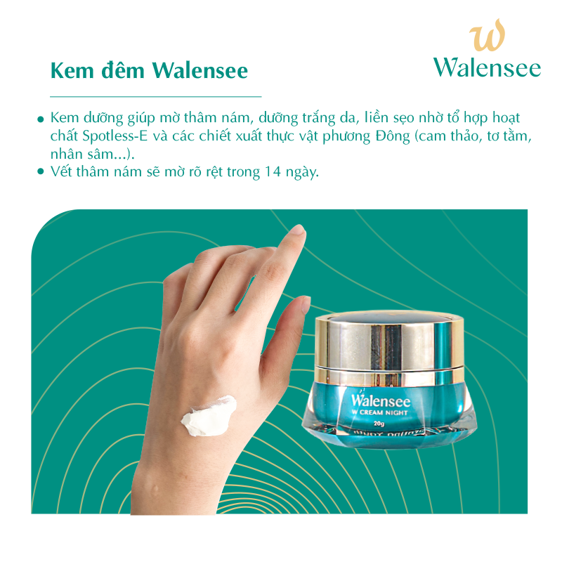Kem dưỡng đêm Walensee với hàm lượng chất dinh dưỡng cao và công thức bào chế chuyên sâu, nó có tác dụng hạn chế được tình trạng khô da, da tổn thương, nhiễm corticoid, đưa da về trạng thái khỏe mạnh ban đầu và xử lý nám tận gốc cho người xử lý nám nhiều lần không khỏi. Hơn nữa sử dụng kem dưỡng đêm Walensee Kem dưỡng giúp mờ thâm, liền sẹo nhờ tổ hợp hoạt chất Spotless-E và các chiết xuất thực vật phương Đông (cam thảo, tơ tằm, nhân sâ) với công dụng: