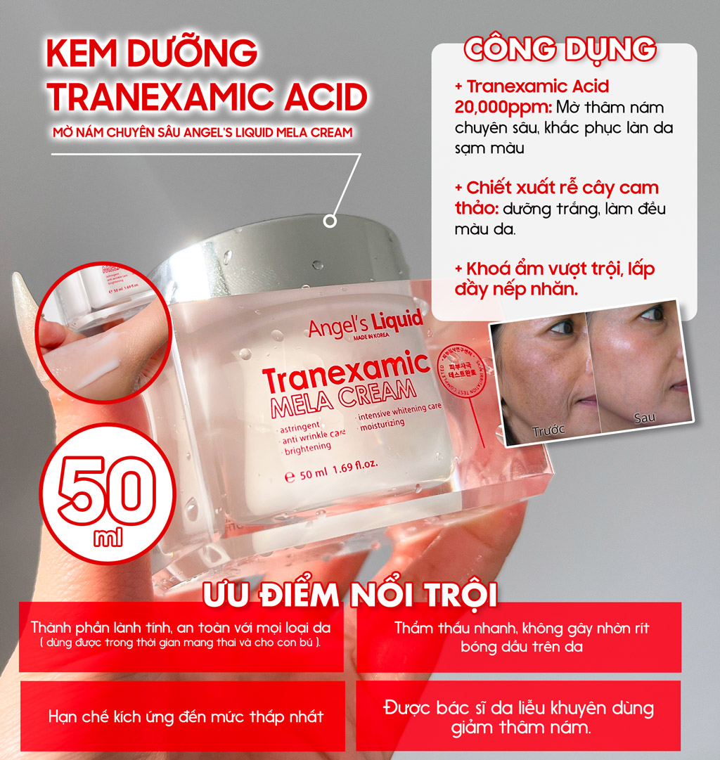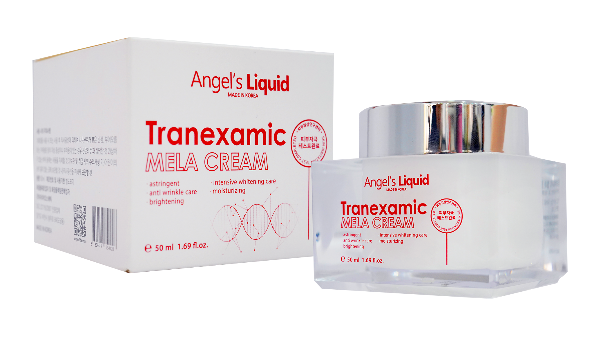 Mua tại TiktokKem Dưỡng Tranexamic Acid Mờ Nám Chuyên Sâu Angel's Liquid Mela Cream 50ml Thương hiệu: ANGEL'S LIQUID Xuất xứ: Hàn Quốc Dung tích: 50ml Hạn sử dụng: 36 tháng Sản phẩm giúp mờ nám chuyên sâu, giảm dấu hiệu lão hóa sớm của làn da, làm đầy các nếp nhăn hiệu quả, kích thích sản sinh collagen, tăng cường độ đàn hồi cho da gấp 3 lần. Đặc biệt, giúp dưỡng trắng, đều màu da tối ưu. Ngoài ra, làm mờ các dấu hiệu thâm nám trong quá trình mang thai. Duy trì cho bạn một làn da trắng khoẻ như kim cương THÀNH PHẦN: