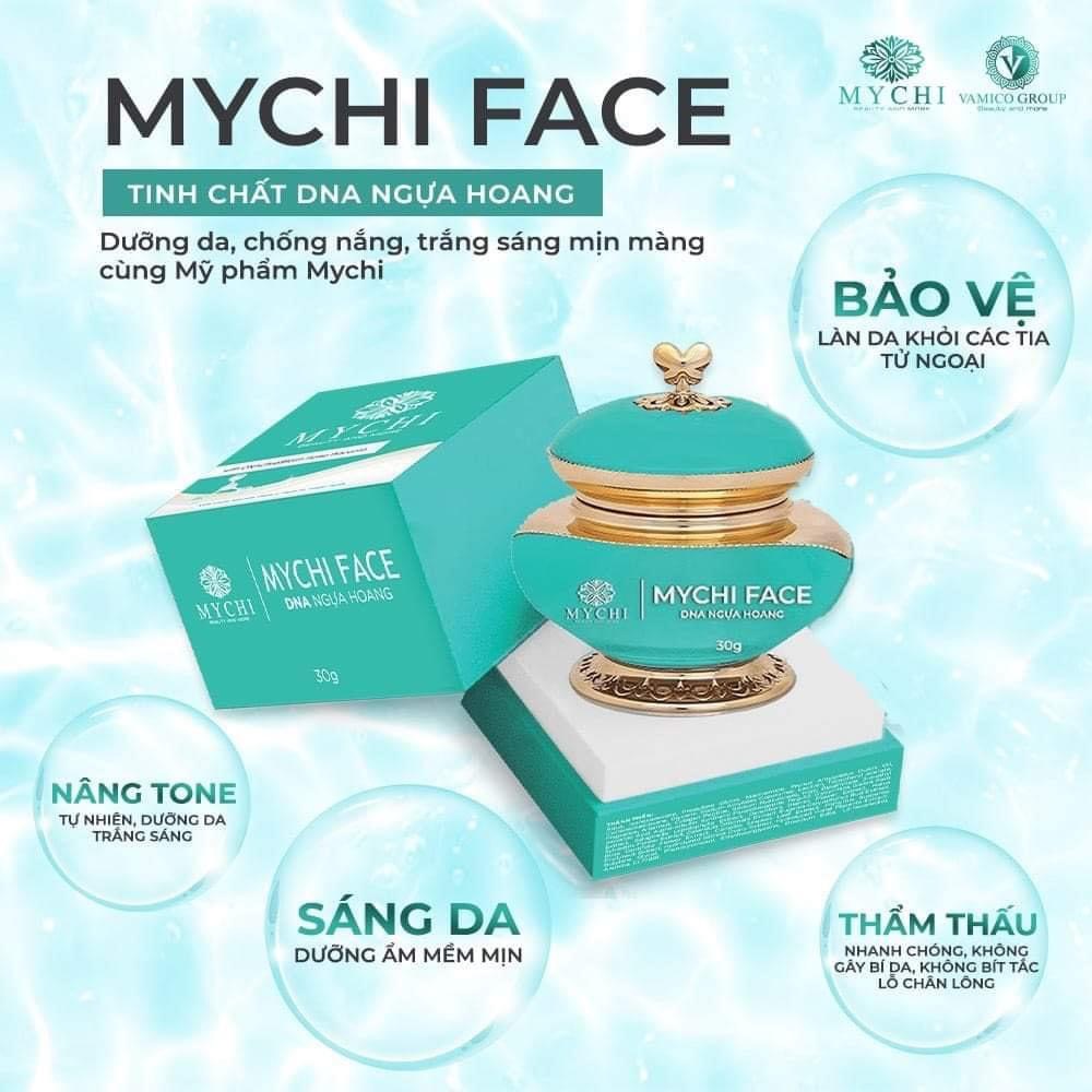 - CÔNG DỤNG Chắc trong chị em đây không ai là không muốn bảo vệ da mặt của mình nhỉ. Bài hôm trước chúng ta đã biết về kem chống nắng của MyChi. Hôm nay Mỹ Phẩm MyChi cho ra mắt bộ sản phẩm Kem Face MyChi để giúp da mặt của mình được bảo vệ 1 cách tuyệt đối – Làm trắng da và đều màu da, cấp ẩm cho da. – Tăng độ đàn hồi cho da, tăng cường sản sinh collagen giúp da căng mướt hồng hào tự nhiên – Hỗ trợ ngừa nám, phá huỷ sắc tố melanin gây nám da. làm sáng và dịu da. Có khả năng thẩm thấu sâu ( thẩm thấu đa tầng) vào da giúp làm sáng da đối với các tổn thương do ánh nắng mặt trời có thể nhìn thấy, đốm đồi mồi hoặc sẹo và từ đó cải thiện khả năng chống lão hóa trên da. – Cải thiện sắc tố da tại các điểm bị tổn thương vì sẹo mụn, dưỡng sáng da từ từ nhẹ nhàng hơn, thích hợp với làn da nhạy cảm và kể cả da nhiễm corticoid