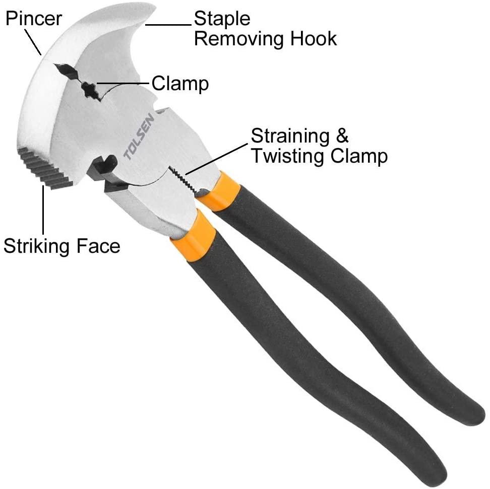 Mua tại TiktokKềm hàng rào 10 inch/250mm Tolsen 10301 dùng để đóng/nhổ đinh kẹp, giữ và kéo thẳng dây, nối dây, cắt dâ Kềm được sử dụng rộng rãi trong các ngành kỹ thuật điện, xây dựng, cơ khí, gara ô tô, gia đình… Ưu điểm nổi bật kềm Tolsen 10301 •Kềm không gỉ, có độ bền cao •Thiết kế nhỏ gọn, tinh xảo •Cấu tạo đơn giản giúp thao tác thuận tiện •Sản phẩm chống gỉ sét, chịu được các điều kiện làm việc khắc nghiệt •Thích hợp sử dụng trong nhiều ngành nghề •An toàn và dễ dàng sử dụng •Hiệu quả sử dụng lâu dài Được sử dụng để làm hàng rào thép gai, thép B40. Ngoài ra, với các phụ kiện như búa, móc mũi nhọn, cắt kẽm,đi kèm, có thể dễ dàng kết hợp các chức năng của kìm để mang lại hiệu quả cao nhất Thông số kĩ thuật