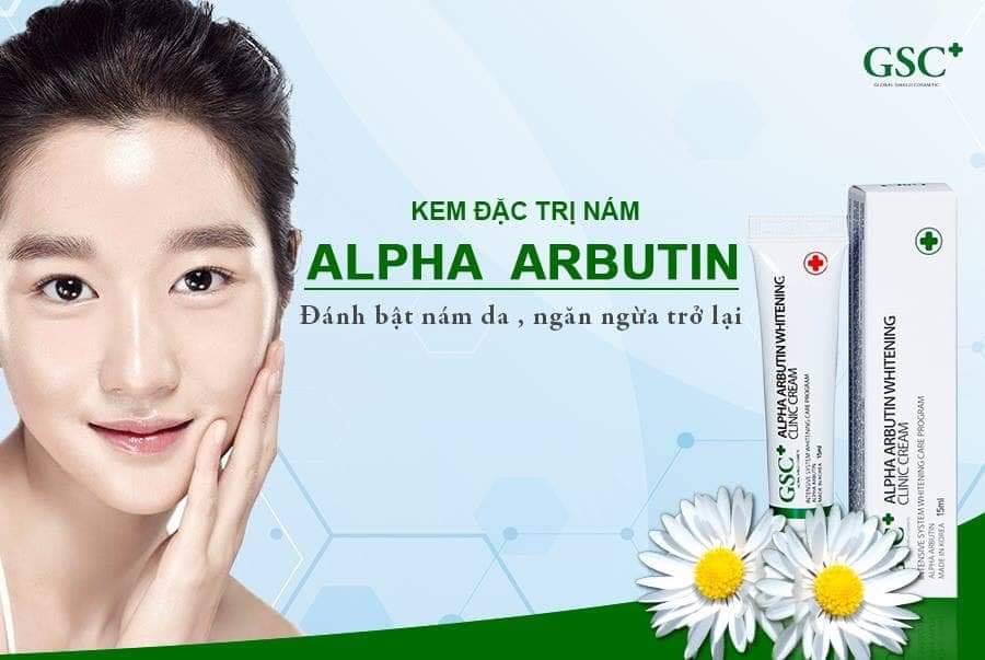 - Kem đặc t rị nám GSC Hàn Quốc với thành phần chính đó là Arbutin – chất làm trắng chức năng. Chất này được chứng nhận bởi Bộ An toàn Thực phẩm và Dược phẩm. Kem t rị nám trắng da GSC Alpha Arbutin Whitening Cream là kem làm trắng da chức năng, giúp duy trì khả năng chống Oxy hóa của da cùng với các Vitamin và các Axit amin, có hiệu quả làm trắng da vượt trội
